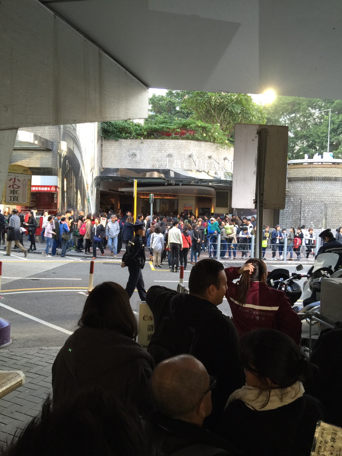 Also kurz den Reiseführer gecheckt und gesehen, das es Richtung Peak Tram eine Art Zoo gibt. Der ist kostenlos. Die Shoppingcenter interessieren uns hier noch weniger als in anderen Städten, da es hier wirklich nur Krimskrams oder Luxuszeug gibt. Also auf zum „Zoo“. Ein langer steiler Aufstieg erwartete uns. Der Zoo war so eine Art Park mit ein paar Käfige mit Vögel und Affen drin. 2-3 Affen waren ganz lustig anzusehen, aber Geld hätten die wirklich nicht nehmen dürfen. Dann sind wir eine Stunde früher wie geplant Richtung Peak Tram gelaufen. Das war auch gut so. Wir standen noch nie in einer Warteschlange um zu warten, das wir uns in eine andere Warteschlange anstellen konnten. 1,5 Stunden standen wir an, um in den Zug zum Peak zu kommen. Das Ticket für hin und zurück hat 10€ gekostet.