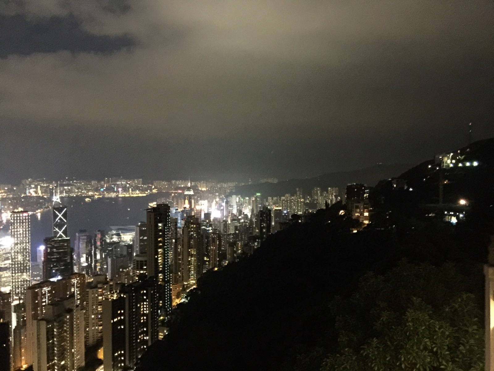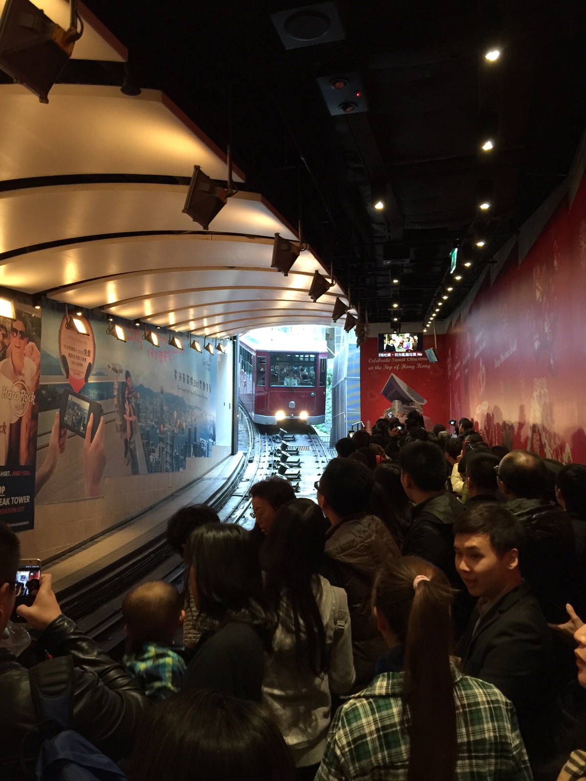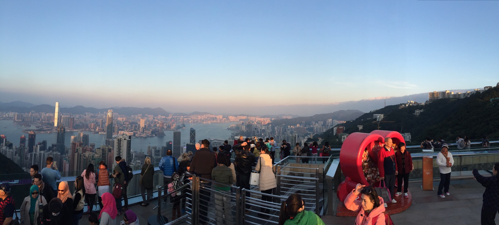 Oben angekommen steigt man in einem Shoppingcenter aus, dass auf dem Dach einen Aussichtspunkt hat. Von dort aus hat man den besten Blick über Hongkong. Aber Achtung. Mit dem Ticket von der Tram kommt man nur einmal auf die Plattform. Wenn man Hongkong von oben mit Tageslicht und im Dunklen sehen will muss oben in der Kälte aushalten oder beim 2. mal noch einmal ca. 5€ zahlen. Wir fanden den Blick im Tageslicht von oben besser. Die Skyline im dunkeln ist unten besser.