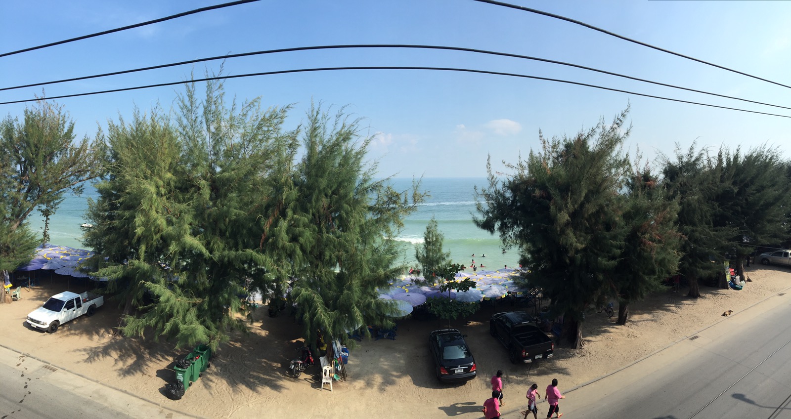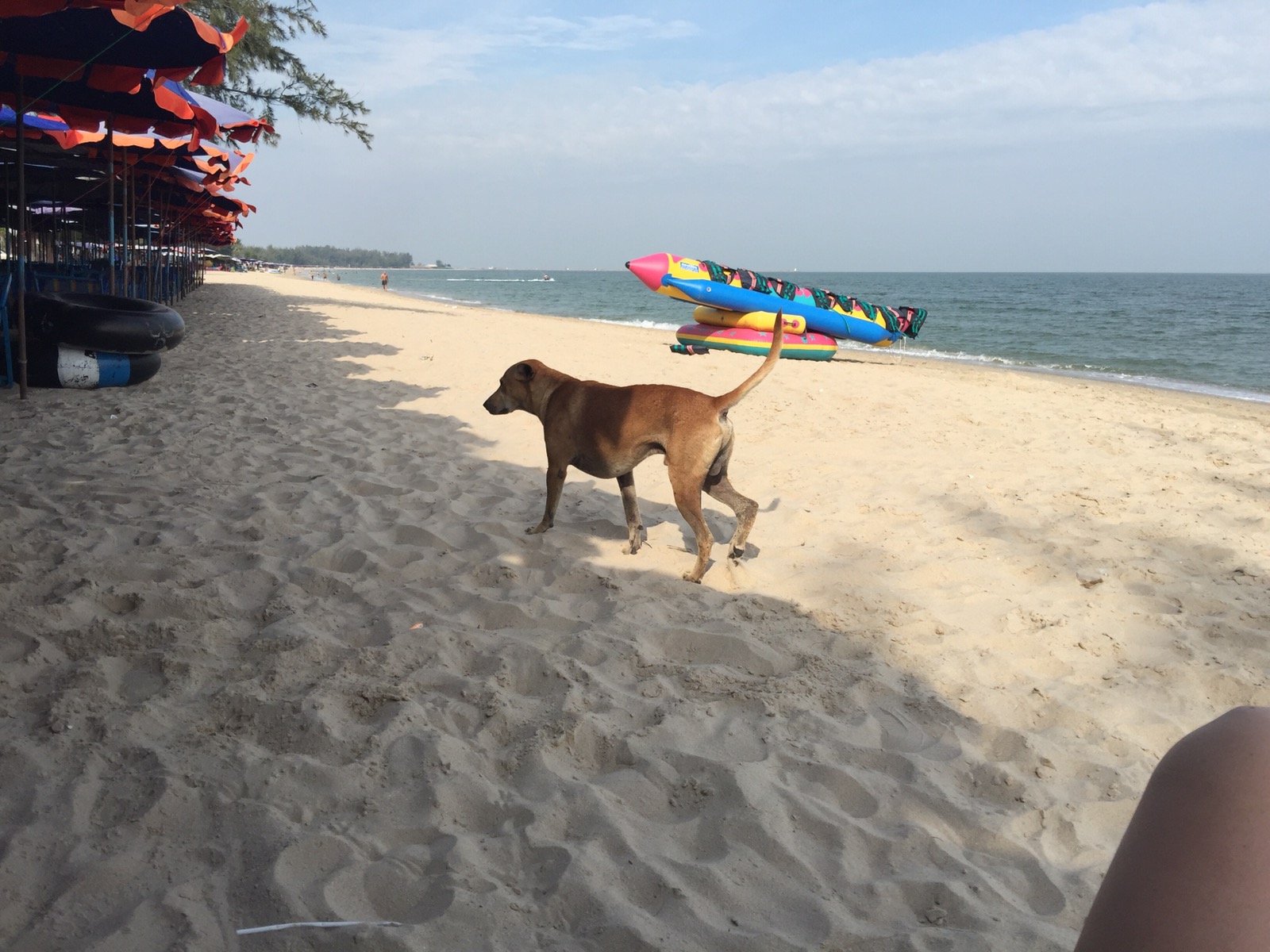 Heute ist ein heisser Tag, selbst für uns, die immer in der Mittagssonne rummrennen. Wir bleiben auf unseren Balkon mit Blick auf den Strand. Am Wochenende wird es hier richtig voll. Da strömen die Thais in das älteste Strandbad Thailands. Schon morgens um 8 Uhr quietschen die Mädels auf dem Bananaboot. Und auch die Strasse vor dem Hotel ist voller Leben. So haben wir ne Menge zum beobachten. Aber es reicht jetzt auch hier. Für Morgen ist der Bus nach Bangkok gebucht. Von dort soll es weiter nach Kanchanaburi gehen.