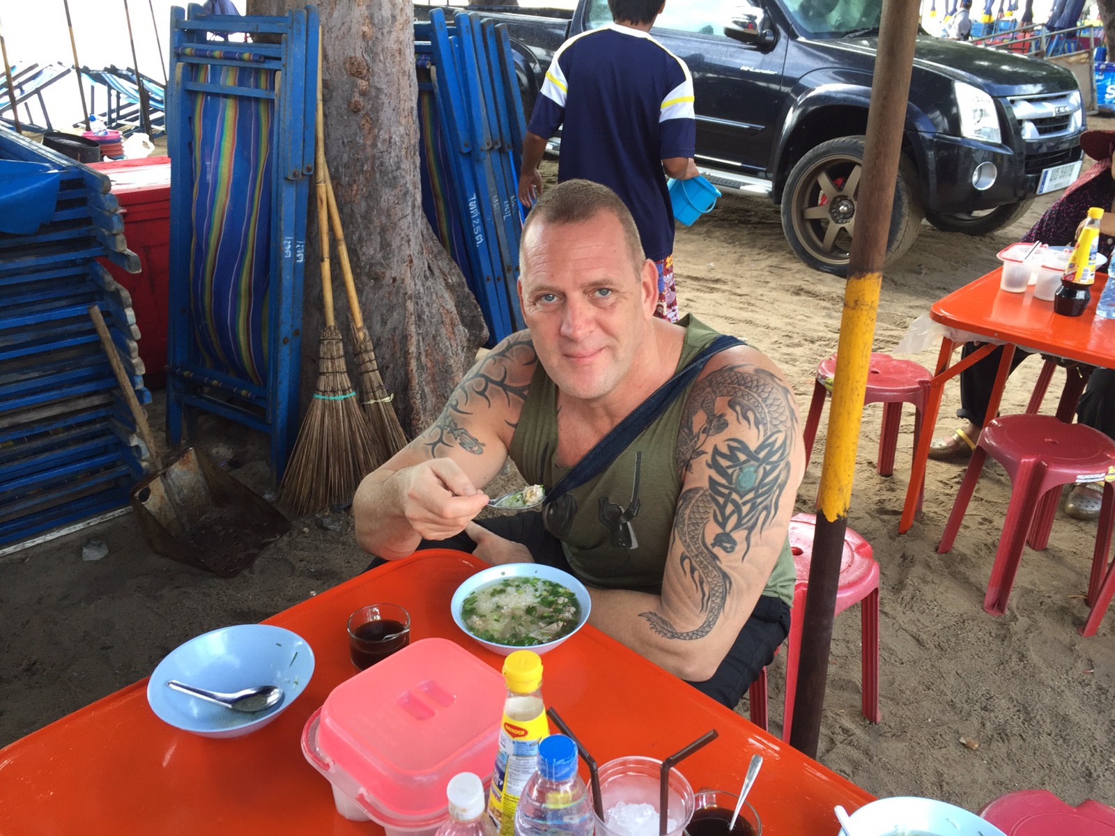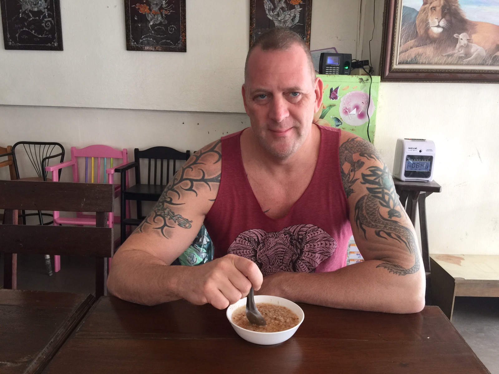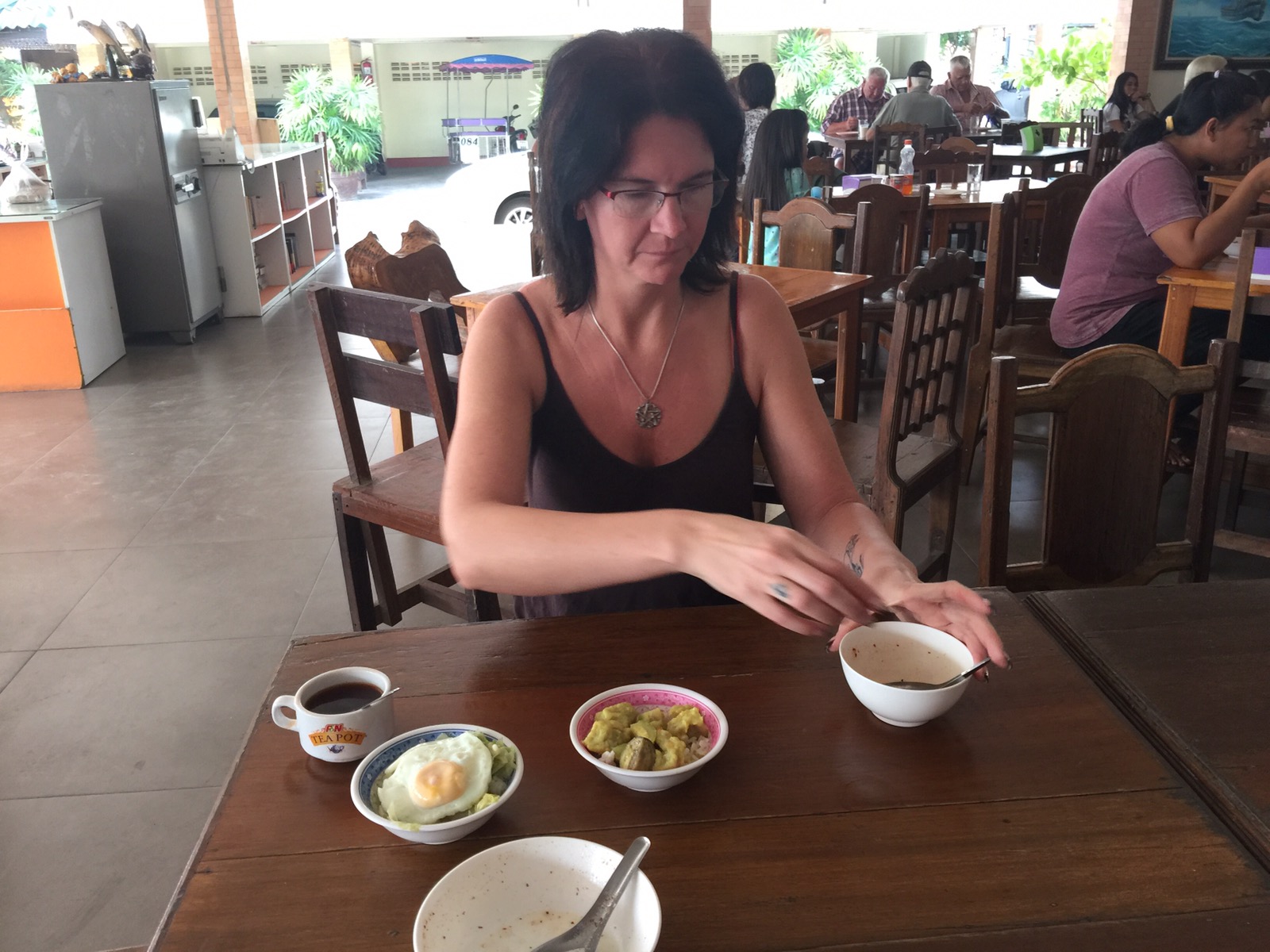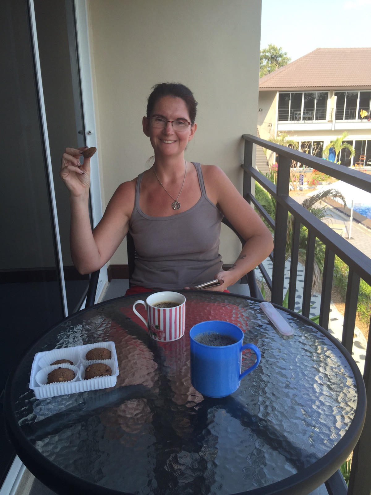 Gegen 7 Uhr gab es dann Kaffee auf dem Balkon und später sind wir dann gegenüber vom Hotel zu einer Garküche um Reissuppe mit Fleischbällchen zu essen. Ich brauchte aber 2 Portionen.