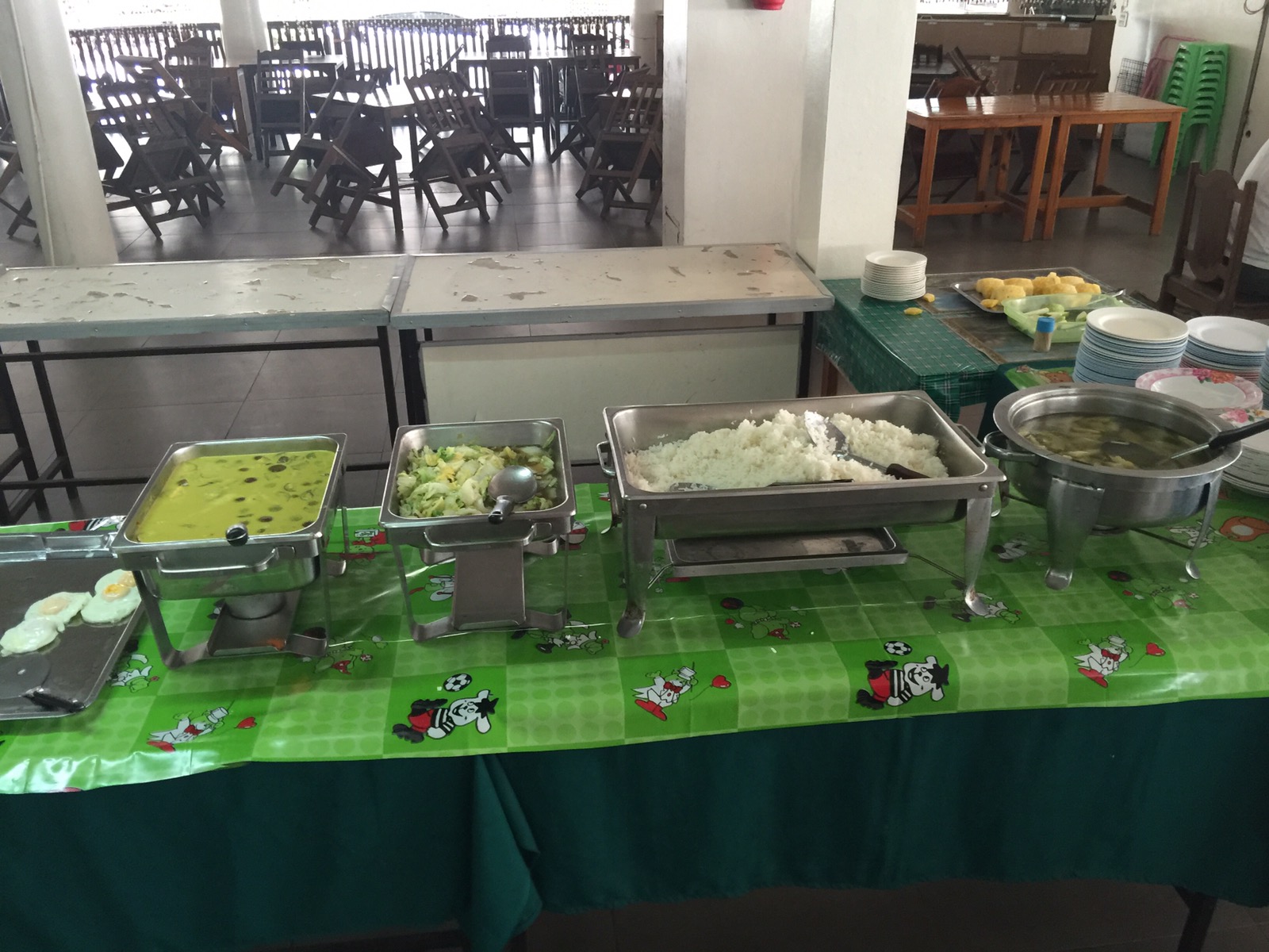 In den Töpfen ist grünes Curry, Gemüse und Reis. Also alles was man für ein gesundes Frühstück braucht.