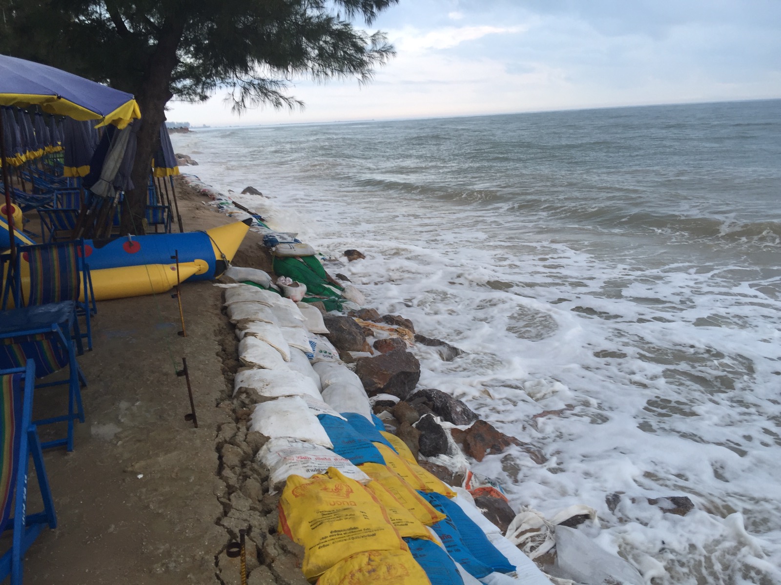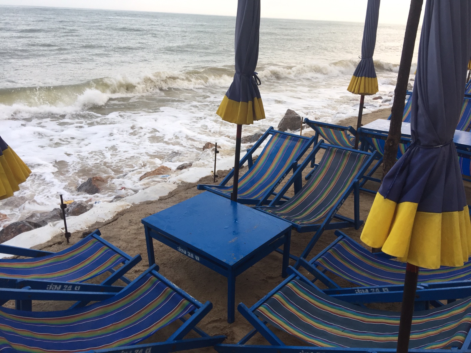 Die Nacht, besser gesagt der frühe Morgen war laut. Wir sind durch die lauten Wellen wach geworden. Auch war plötzlich ein Krach von der Strasse zu hören. Als ich nachgeschaut habe, habe ich gesehen, wie die Leute von den Sonnenliegen ihre Habseligkeiten gerettet haben. Die Wellen waren so hoch, dass sie den Strand abgetragen haben und die Schirme und Liegen mitgerissen haben.