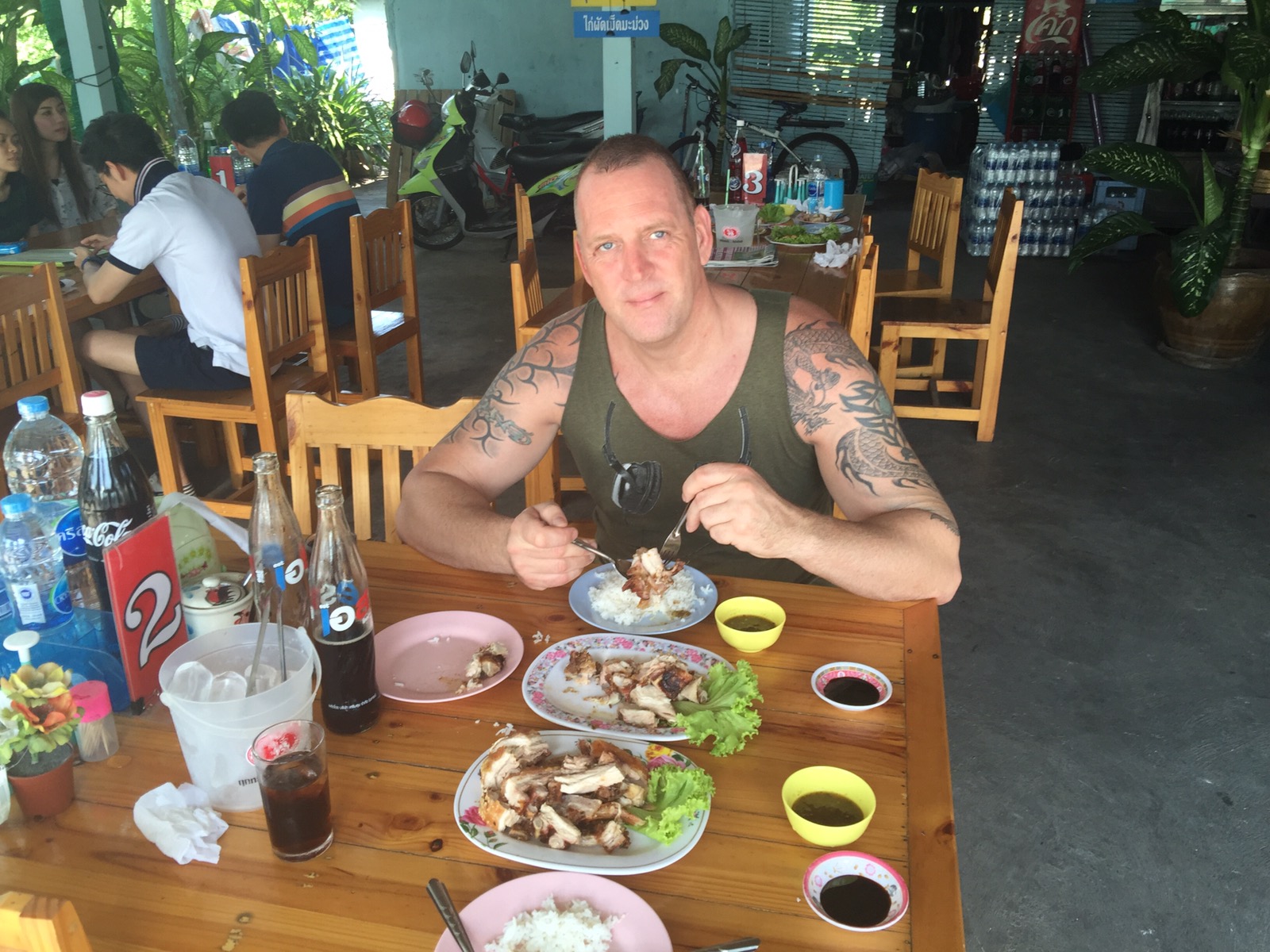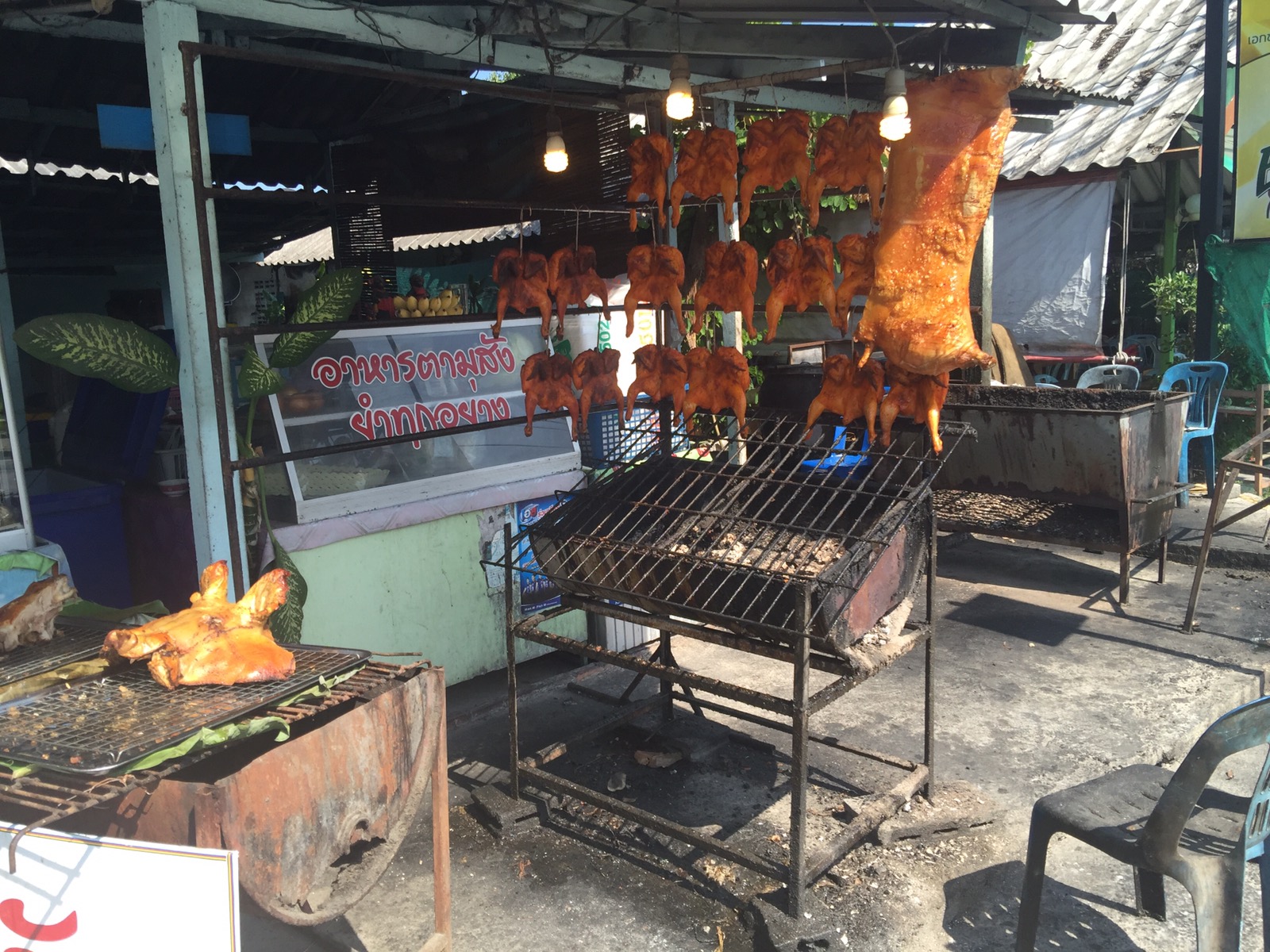 Zum Mittagessen gab es BBQ und die Portion war riesig. Und die Thais an den Tischen neben uns haben sich noch eine Menge Beilagen dazu bestellt. Wir fragen uns, wo diese kleinen Personen das nur hin futtern.