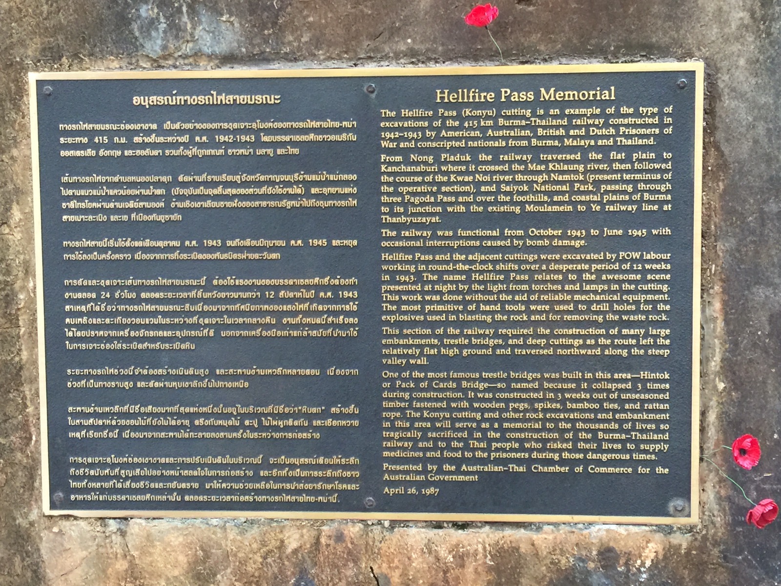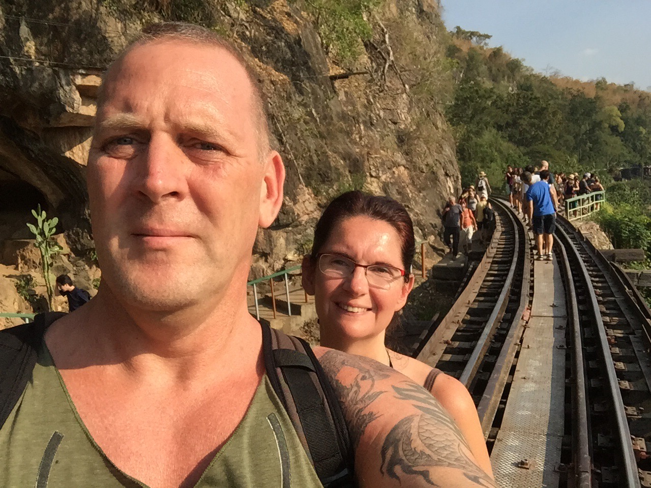 Die Japaner haben im 2. Weltkrieg mit Kriegsgefangenen und Zwangsarbeiter eine über 400 km lange Eisenbahnstrecke zwischen Thailand und Burma durch den Dschungel und in den Fels hauen lassen. 100.000 Arbeiter haben das nicht überlebt. Der Hellfire Pass muss das schlimmste Stück gewesen sein. Er ist ca. 4,5 km lang. Über diese Greultaten der Japaner hört man in Deutschland wenig.