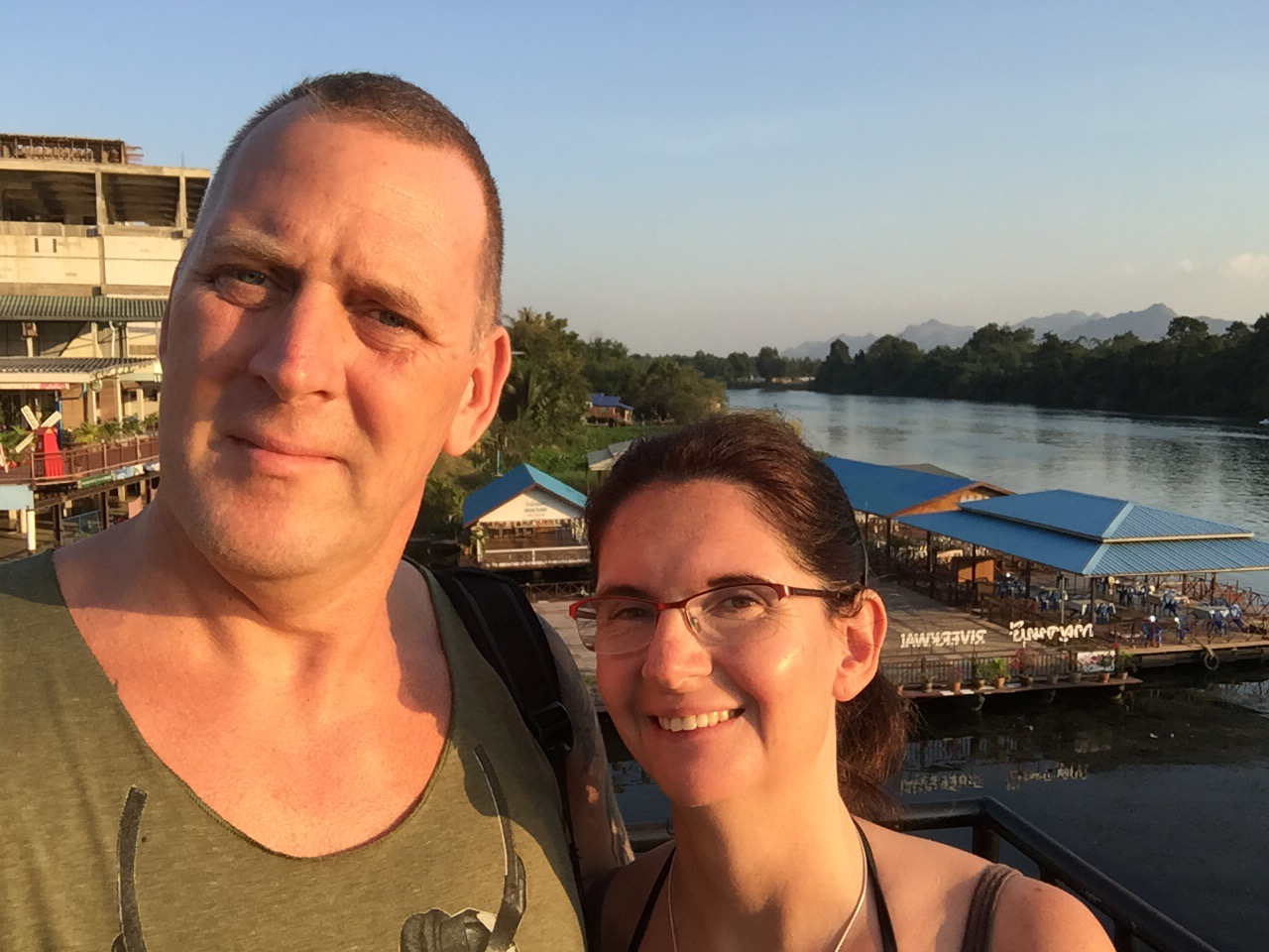 Die Hotelsuche erwieß sich wieder als schwierig. Es ist Hochsaison in Thailand und die besten günstigen Zimmer waren ausgebucht. Wir haben in jedem Hotel gefragt. Die freien Zimmer waren entweder zu teuer oder alte dunkle Buden. Dann sind wir zu einem Hotel, an dem wir eigentlich vorbei gelaufen sind wieder zurück. Eigentlich wollten wir direkt an den Fluss und dieses hatte nur das Restaurant am Fluss. Aber es war neu und sauber und hatte einen Pool. Es lag aber auch etwas abseits. Dann müssen wir halt die 200 Meter laufen.