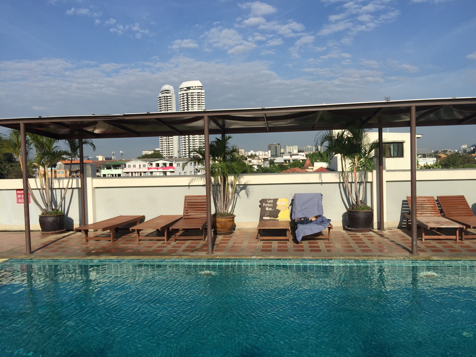 Das Frühstück im Rambuttri Village ist sein Geld nicht wert. Bei uns ist es im Zimmerpreis mit enthalten andere müssen 250 Baht zahlen. Die Töpfe am Buffet sind meistens leer. Und wenn was drin ist, ist die Auswahl nicht gross. Die Zimmer gehen aber. Obwohl zur Strasse raus, hört man nix. Wir sind gleich hoch zum Pool, um noch einen guten Platz zu bekommen. Hat auch funktioniert. Heute mal den ganzen Tag nix tun, um Abends fit zu sein.