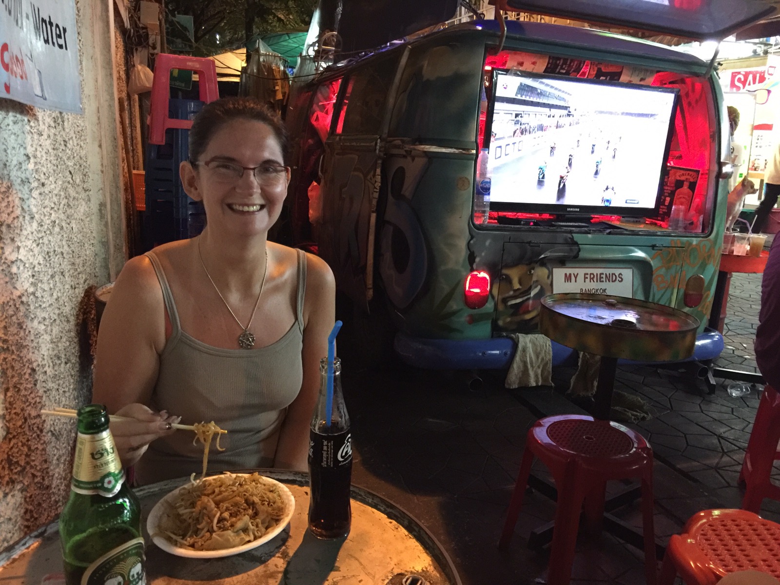 Dieses mal haben wir unsere Gepäckgrösse zu knapp bemessen. Unsere Warmen Sachen von Hongkong mussten noch verstaut werden. Und in meinem Rucksack und in Bekkys Trolli passt nix mehr rein. So haben wir uns entschieden einen neuen Trolli zu kaufen. Haben auch günstig einen erstanden. Dann endlich Zeit um auf der Rambuttri Strasse was zu essen, ein Singha zu trinken und die tolle Atmosphäre hier wieder auf uns wirken zu lassen. Wunderbar.