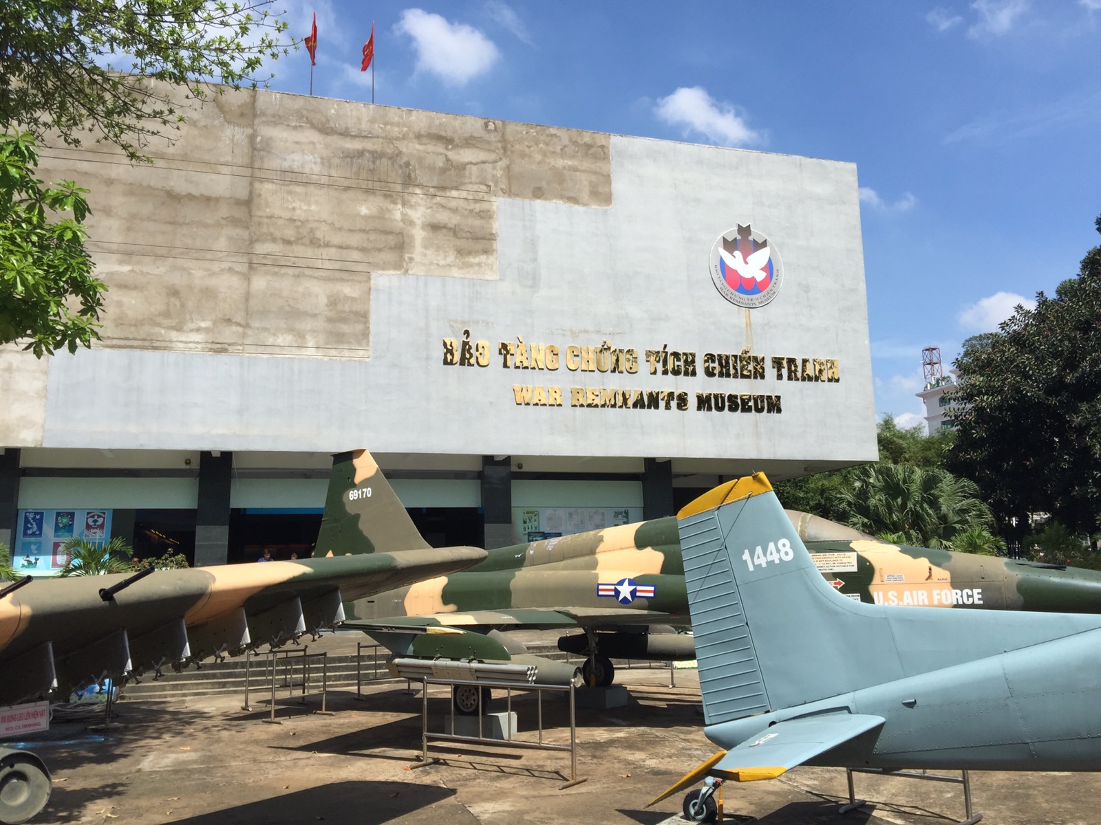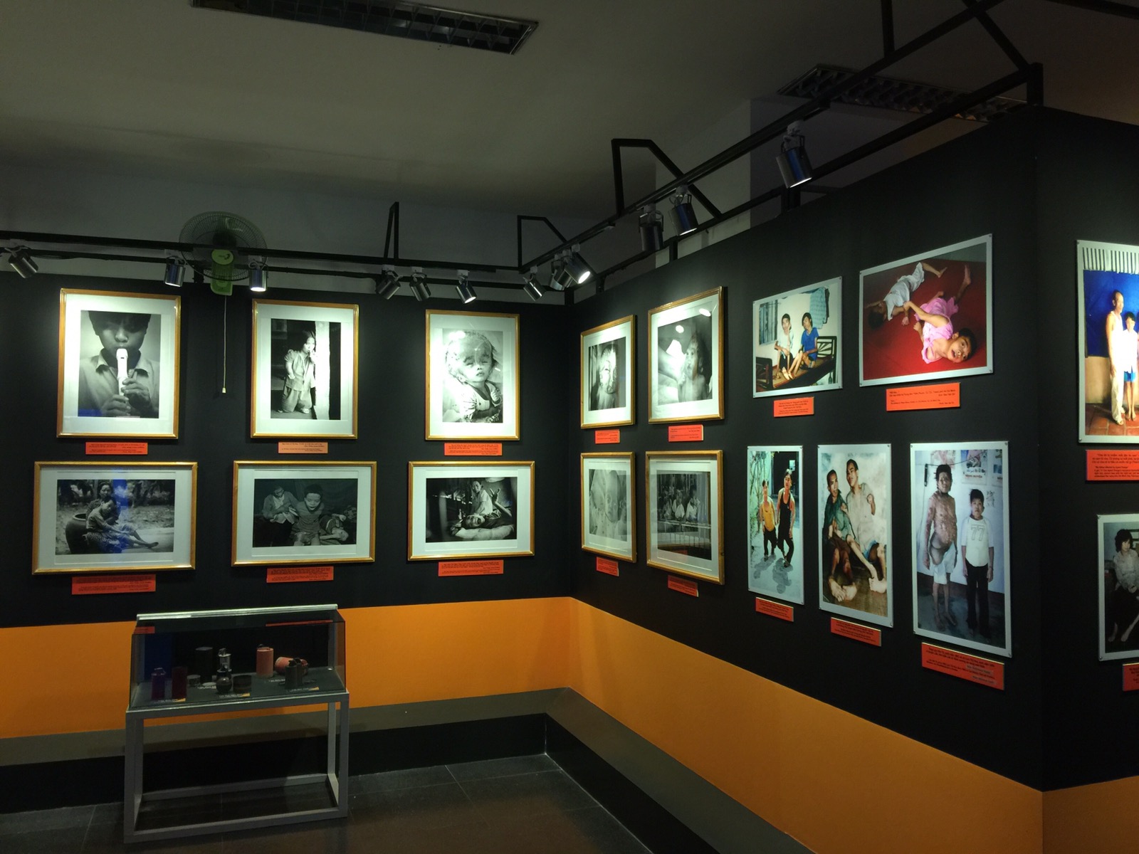 Heute haben wir Vormittags eine Citytour gemacht. Wir wurden gegen 8.30 Uhr vom Hotel abgeholt. Zuerst ging es zum Kriegsmuseum. Als wir gehört haben, das wir hier eine Stunde Aufenthalt haben, dachten wir ojee. Wir sind keine Museumsgänger aber wir wissen auch um die schreckliche Vergangenheit die hier in Vietnam gar nicht so lange her ist. Aber eine Stunde? Das Gebäude, vor dem Panzer und Kampfflugzeuge stehen, hat 3 Etagen mit Räume voller Fotos. In der ersten Etage waren Bilder und Dokumente von Ländern die mit Vietnam sympathisiert haben. In der 2. Etage hingen Bilder, die von der vietnamesischen Seite her fotografiert wurden und in der 3. Etage von der amerikanischen Seite aus. Die Bilder auf der 2. Etage waren teilweise sehr verstörend. Vor allem die Bilder von Menschen die von den amerikanischen Gift „Agent Orange“ betroffen waren. Dieses Gift wurde eingesetzt um die Wälder zu entlauben. Es hat natürlich bei den Bäumen nicht halt gemacht. Diese Bilder werde ich hier nicht im großen zeigen. Sie sind wirklich schrecklich. Unten ein Bild vom weiten fotografiert, dass das schlimme erahnen lässt.