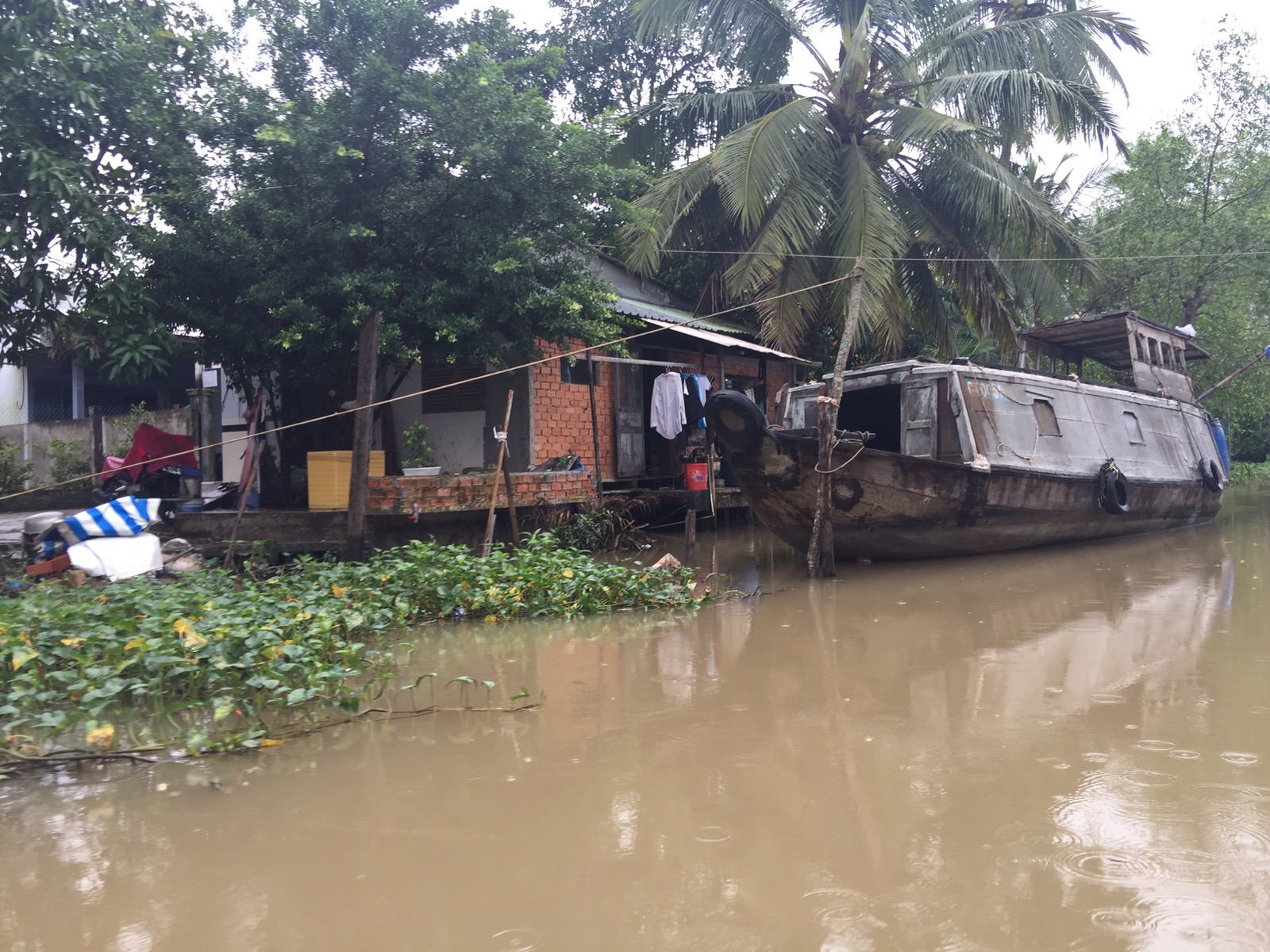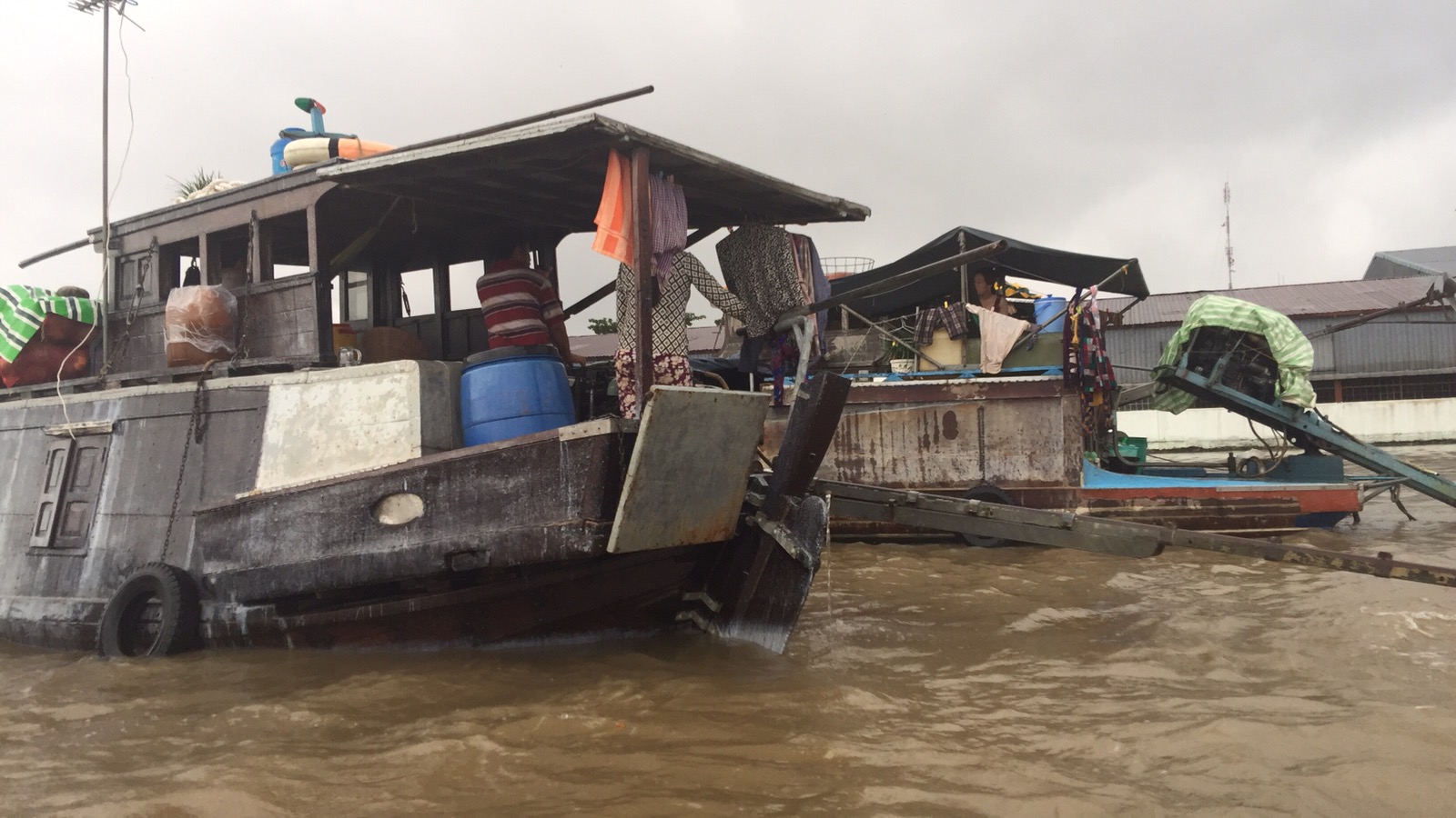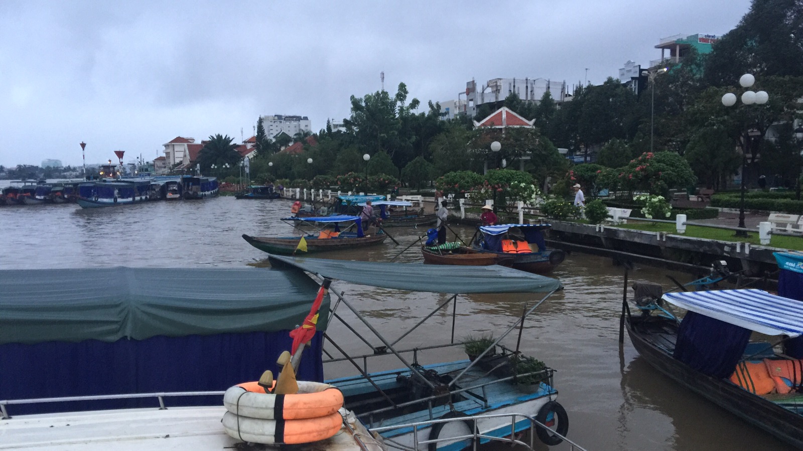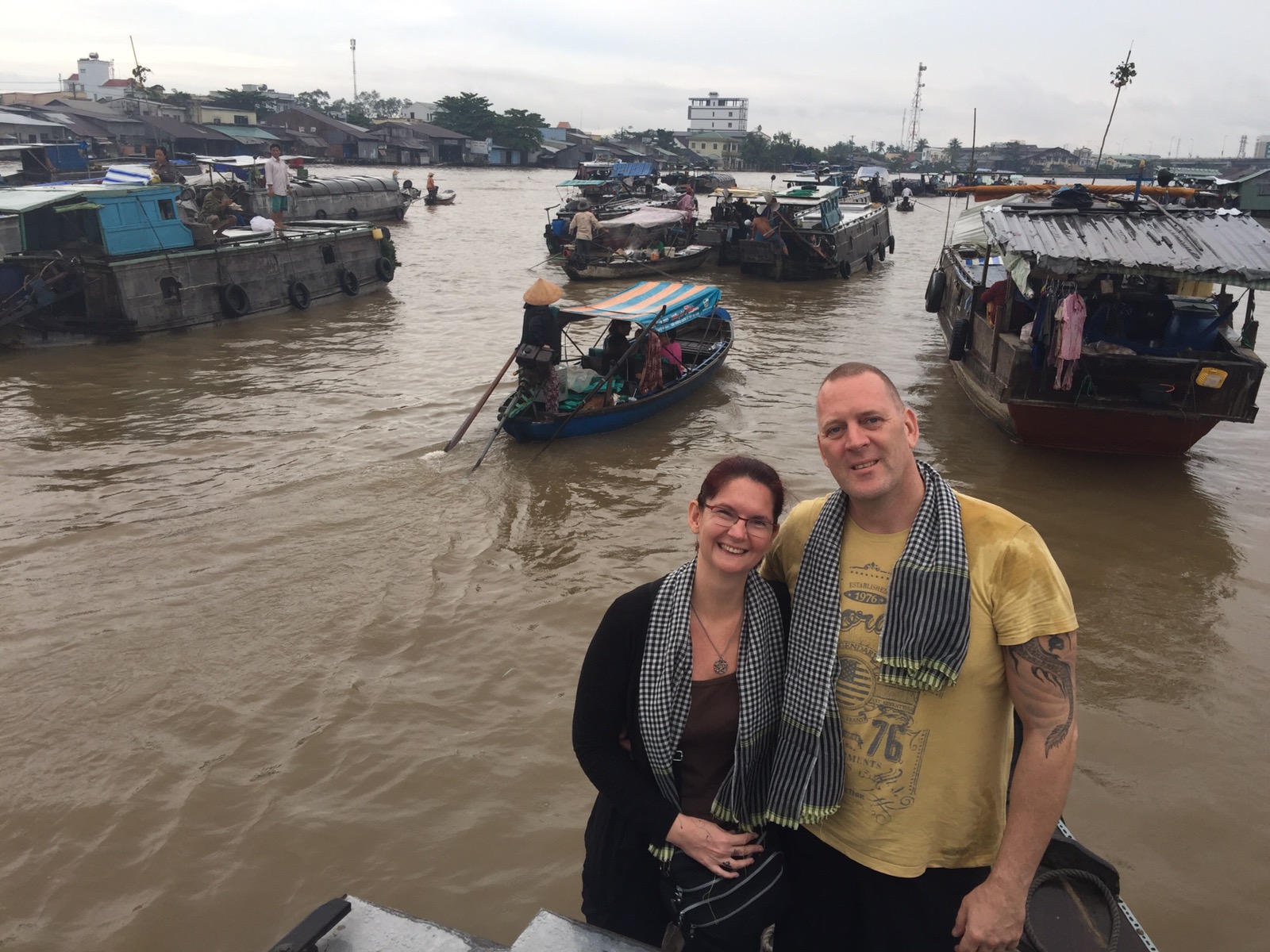 Wir hatten Schwierigkeiten ein Restaurant zu finden. Hier gibt es fast nur Garküchen, an denen selbst wir nix holen. Es steht nirgends auf englisch dran, welches Tier dort gerade gekocht wird. Und hier in Vietnam ist die Wahrscheinlichkeit groß eine Ratte auf den Teller zu bekommen. Nach langen suchen haben wir was zum Mittagessen gefunden. Anschließend haben wir auf der Uferpromenade ein Boot gechartert um zu den Fischerdörfern auf dem Mekong zu fahren. Viele von den Bewohnern dieser Dörfer betreten selten das Land. Ihr ganzes Leben spielt sich auf den Häusern und in ihren Booten ab.