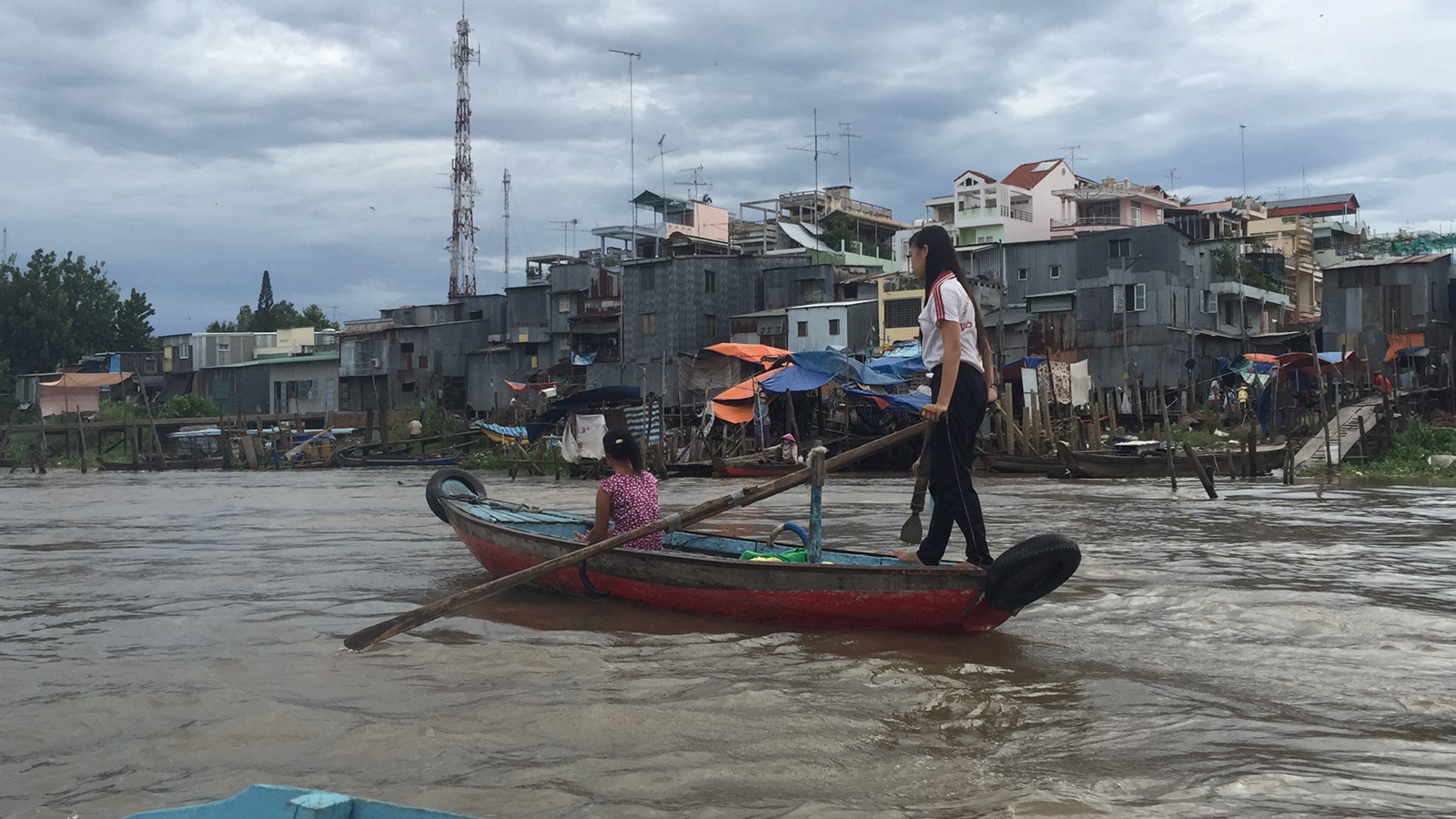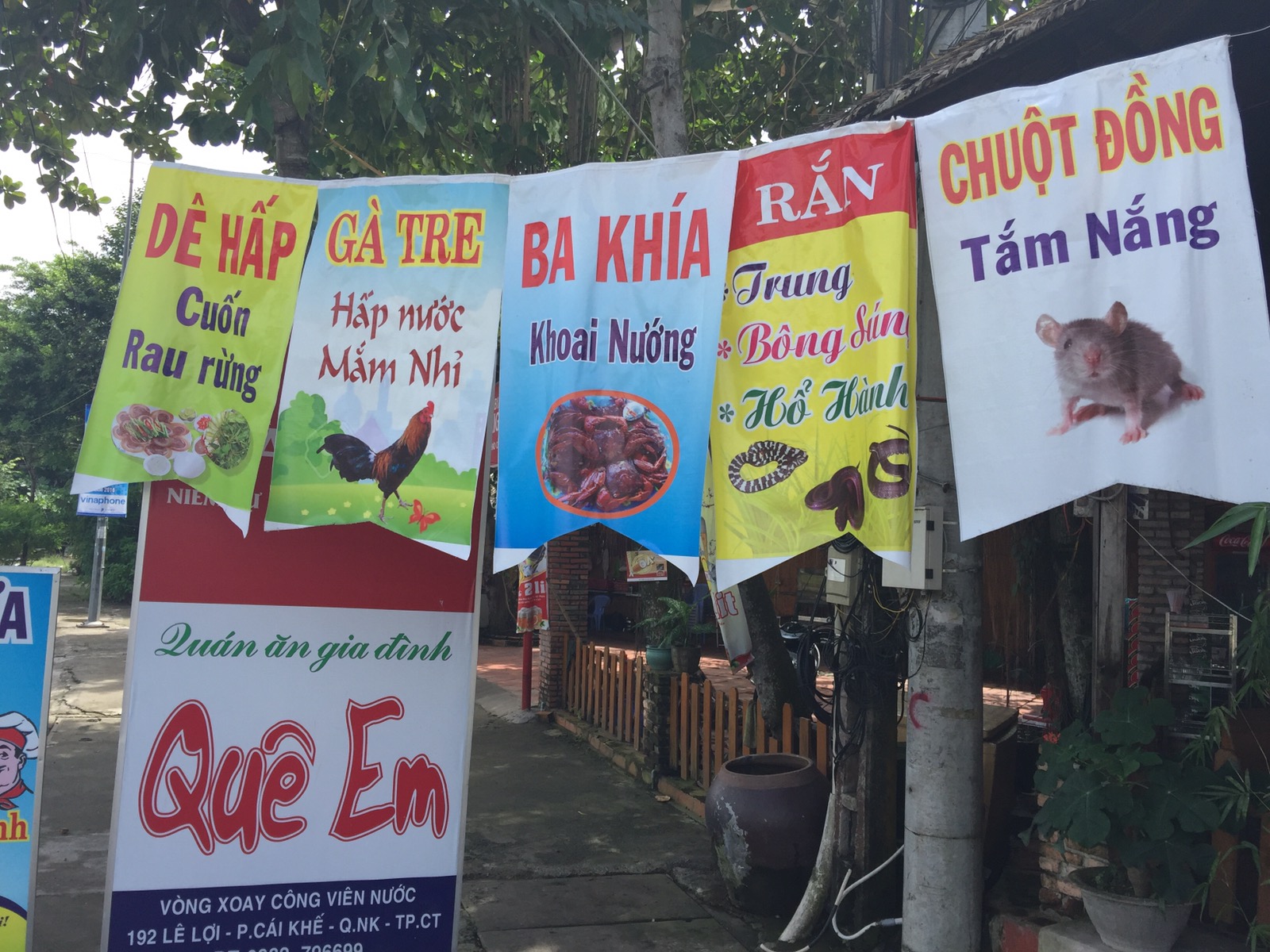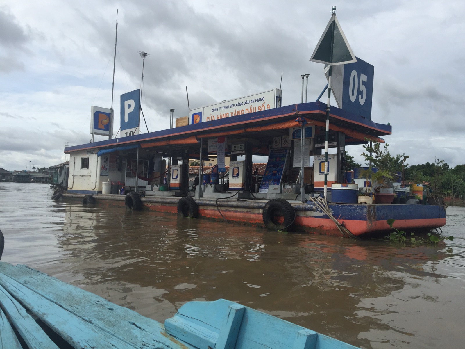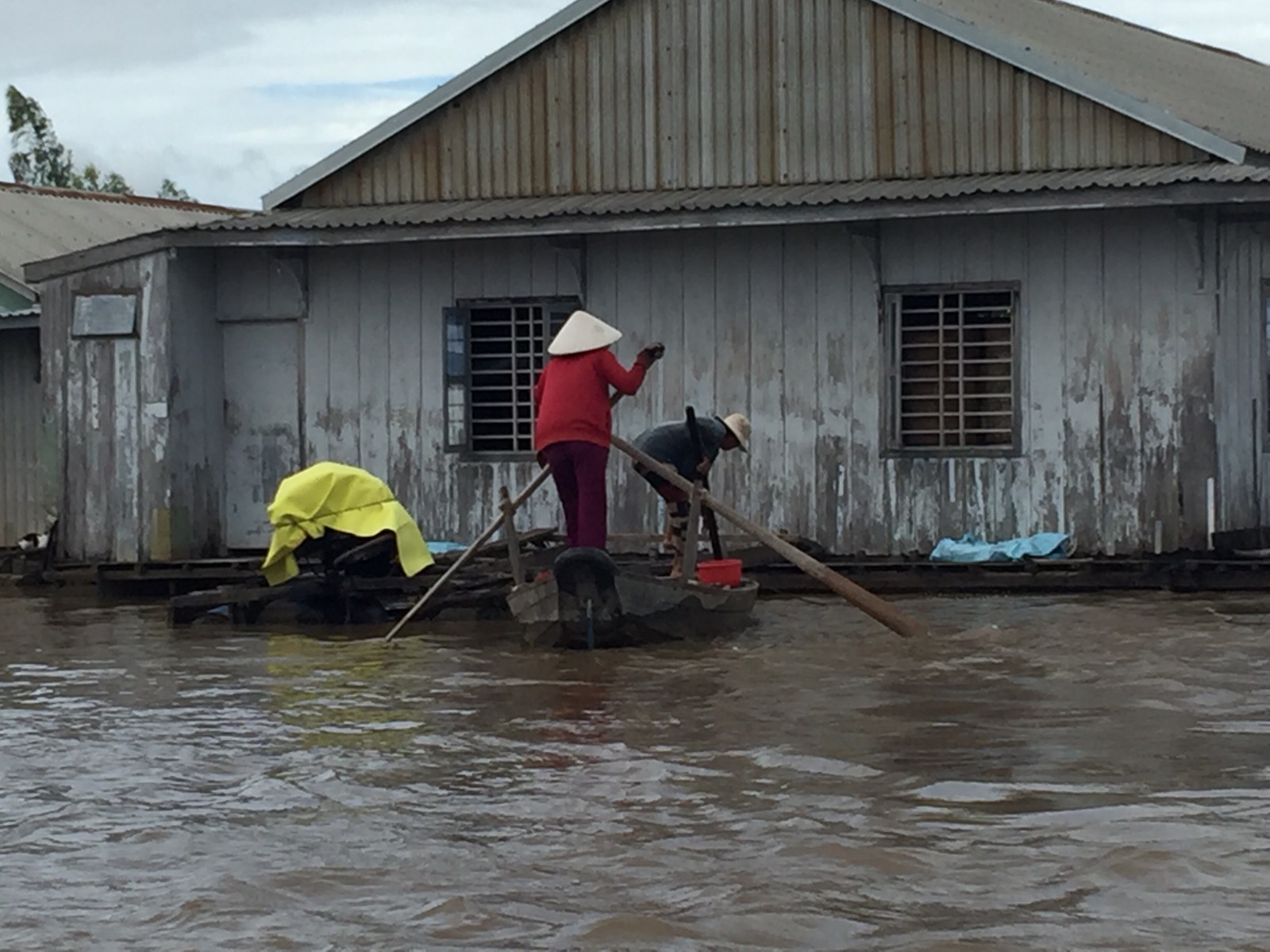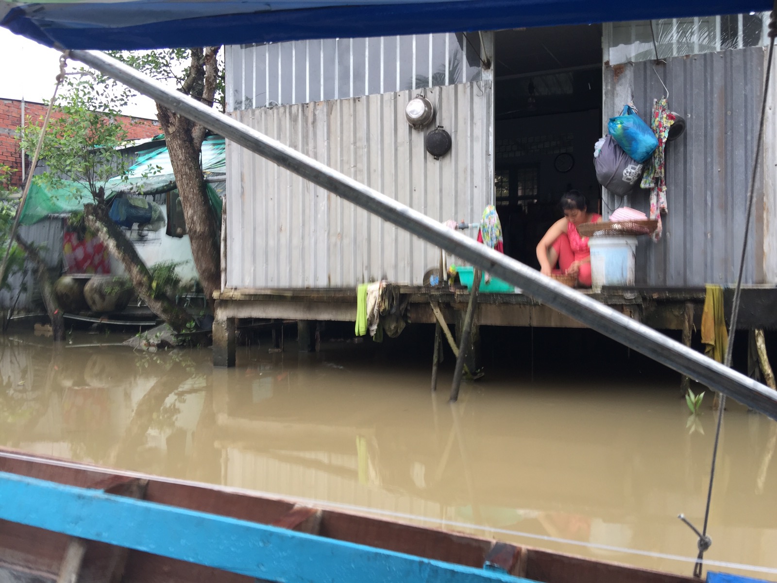 Wir hatten Schwierigkeiten ein Restaurant zu finden. Hier gibt es fast nur Garküchen, an denen selbst wir nix holen. Es steht nirgends auf englisch dran, welches Tier dort gerade gekocht wird. Und hier in Vietnam ist die Wahrscheinlichkeit groß eine Ratte auf den Teller zu bekommen. Nach langen suchen haben wir was zum Mittagessen gefunden. Anschließend haben wir auf der Uferpromenade ein Boot gechartert um zu den Fischerdörfern auf dem Mekong zu fahren. Viele von den Bewohnern dieser Dörfer betreten selten das Land. Ihr ganzes Leben spielt sich auf den Häusern und in ihren Booten ab.