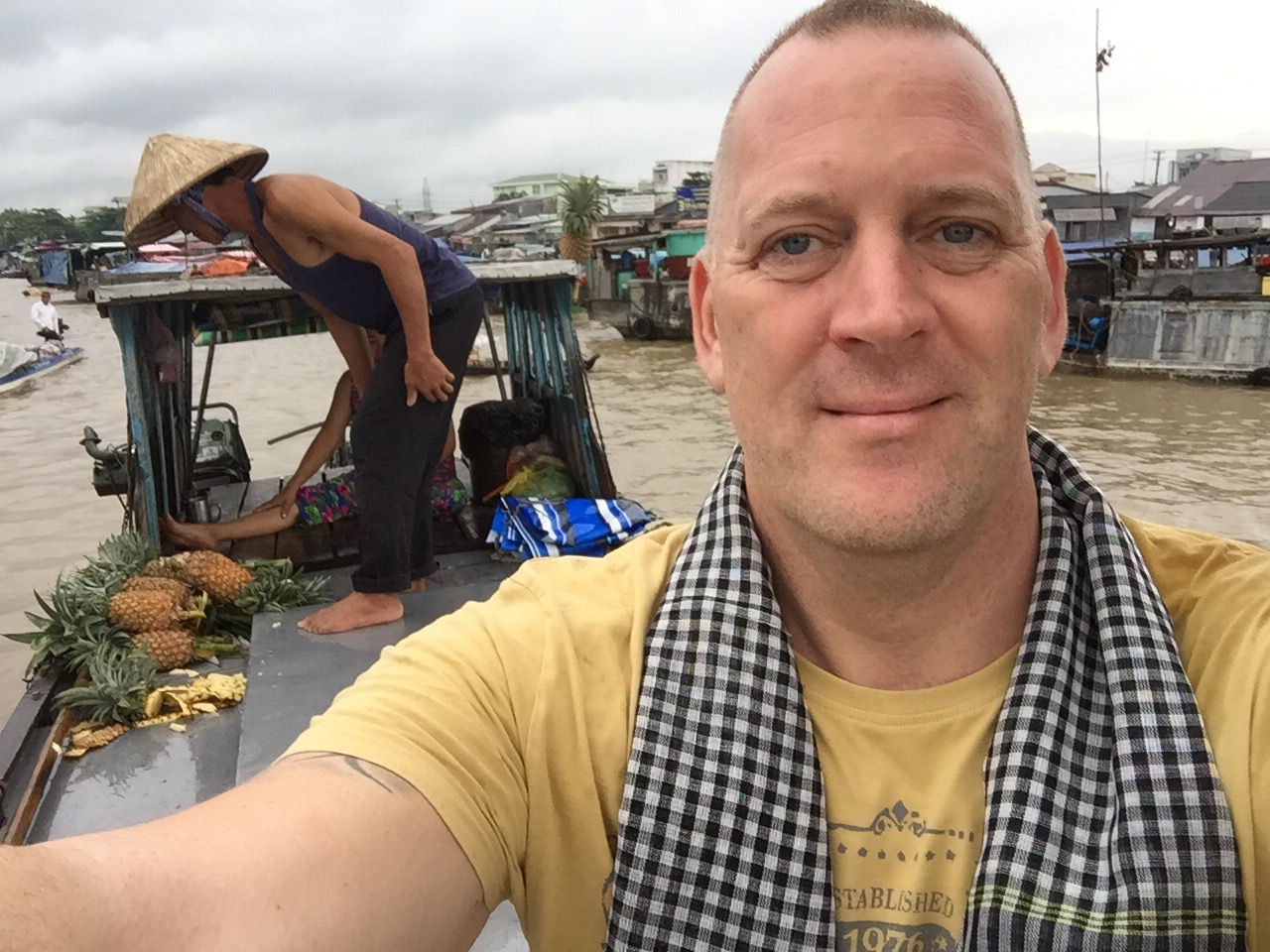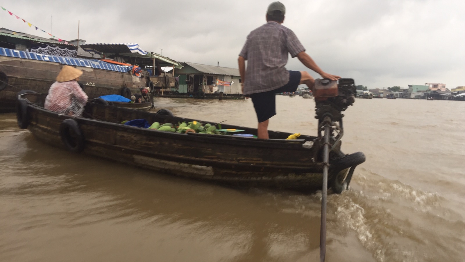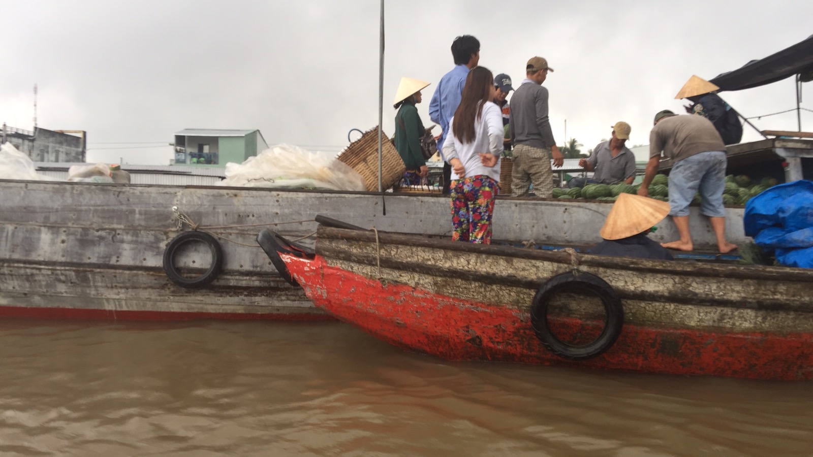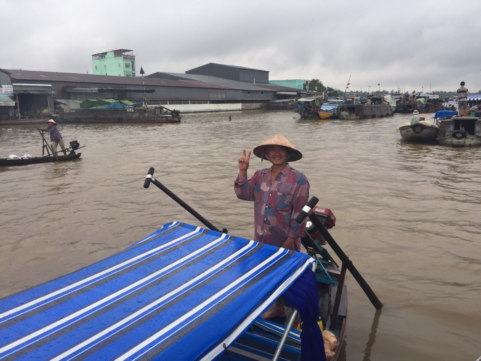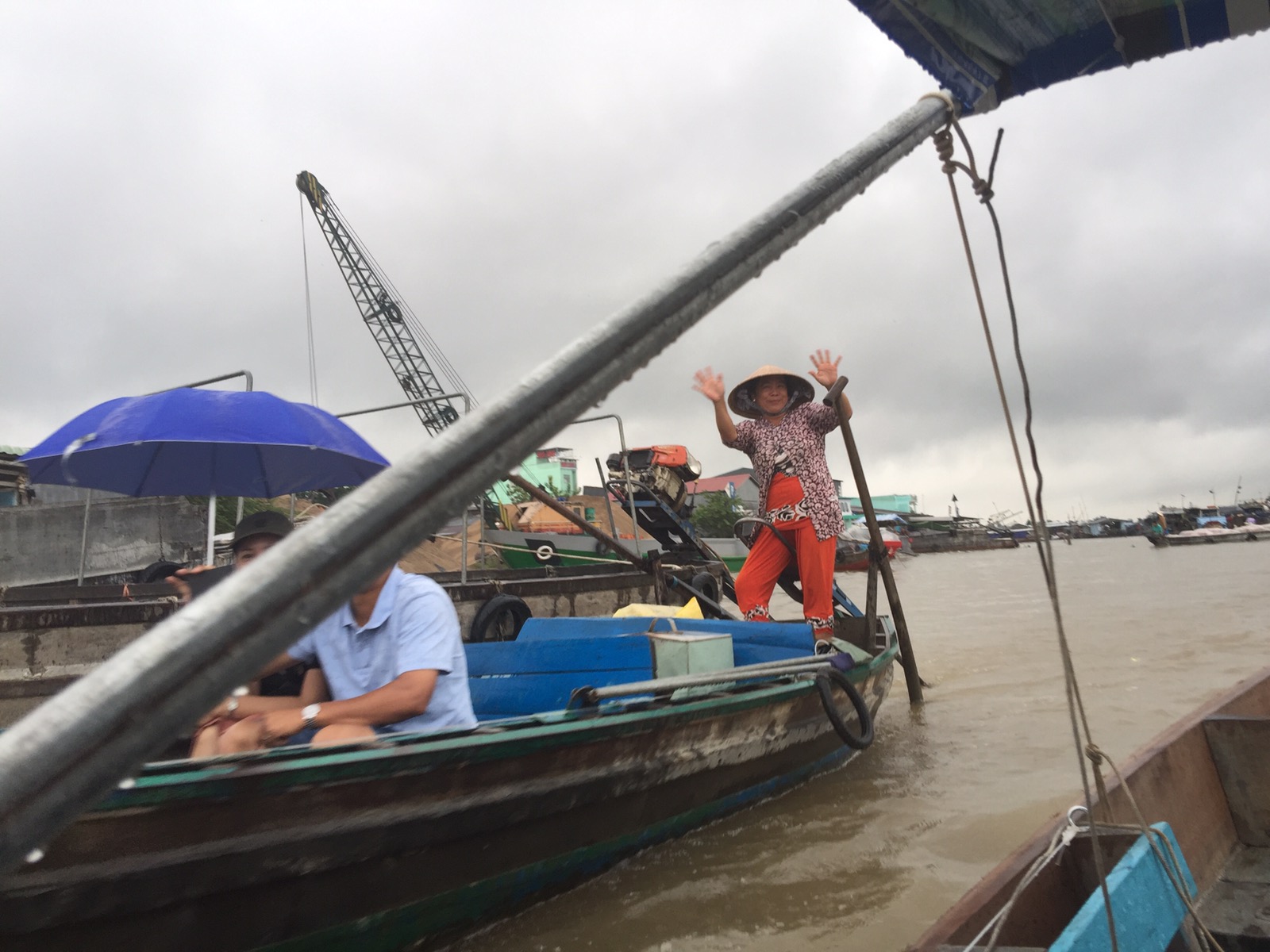 Pünktlich wurden wir von unserem Guide in Empfang genommen. Wir wollen zu den größten schwimmenden Markt auf den Mekong, dem Markt vom Cai Rang. Eigentlich ist es ein Nebenarm vom Mekong aber darum nennt man das auch Delta, weil es viele Nebenarme gibt. Mit dem Wetter hatten wir leider Pech. Normalerweise regnet es Nachmittags aber gerade heute fängt es schon früh an. Muss man das Beste daraus machen. Wir hatten Glück mit unserm Guide und es wurde ein interessanter Morgen.