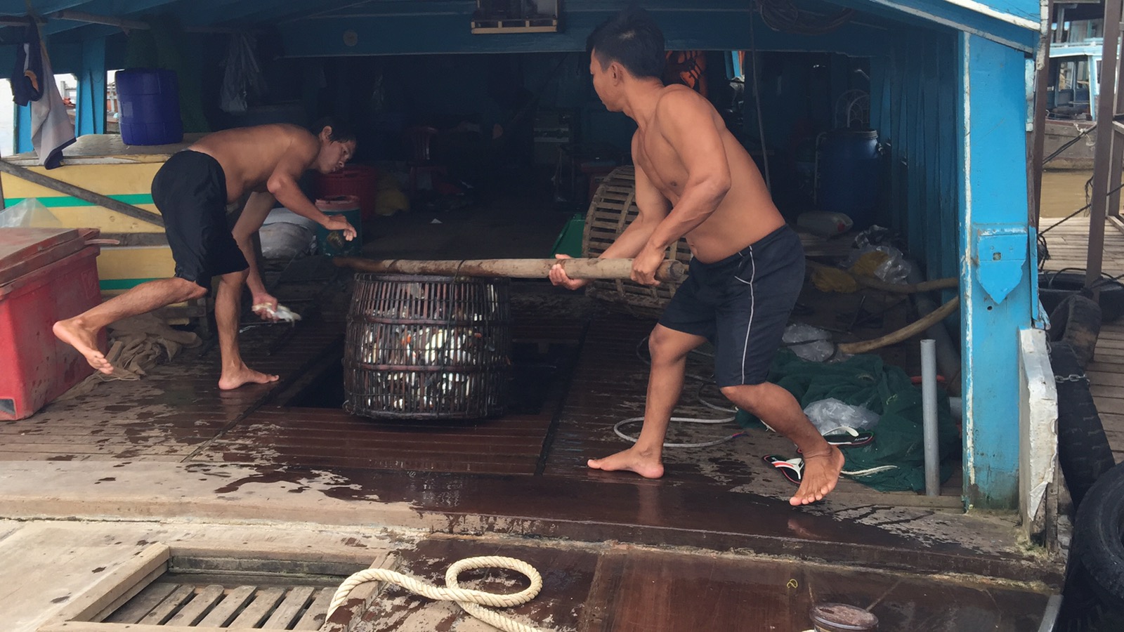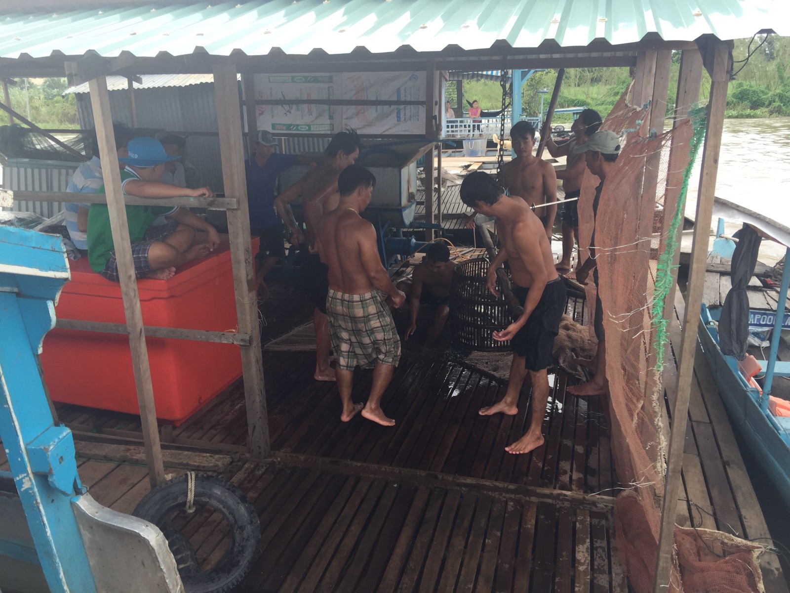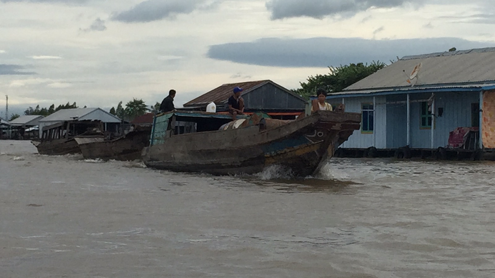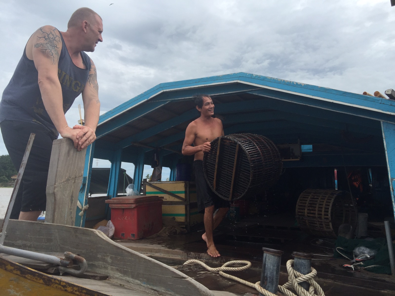 Wir saßen gerade beim Frühstück als ein Minibus vorfuhr und der Fahrer ins Hotel kam. Es war 6.45 Uhr und als Abholzeit stand auf unserem Ticket von 7-8 Uhr drauf. Gut das wir schon alles gepackt hatten. Ich war mit meiner Nudelsuppe schon fertig. Bekkys Schüssel war aber noch fast voll. Ruhig weiter essen konnte sie dann doch nicht und so sind wir gleich in den Bus gestiegen. Nach wenigen Minuten war die Fahrt auch schon wieder vorbei. Am Pier angekommen wurden uns die Papiere für das Visa ausgehändigt. Wir wollen mit dem Boot nach Kambodscha fahren. Es sollte 8.30 Uhr losgehen und gegen 14.00 Uhr sollen wir in Phnom Penh sein. Aber was sollen wir schon kurz vor 7 Uhr am Pier? Des Rätsels Lösung kam prompt. Uns wurde noch eine Zwangstour aufgebrummt. Einmal zu einer Fischfarm und zu einem moslemischen Dorf. Gut das wir gestern schon eine Tour gemacht haben. Aufgefallen ist uns auch, das die gleichen Leute wie gestern Abend im Restaurant auch hier auf dem Boot sind. War wohl doch das einzige Restaurant im Ort, wo ein Europäer essen konnte. Alle wollen aber nicht nach Kambodscha einige haben nur die Tour gebucht. Und da es so wenige Personen waren, haben die uns einfach dazu geholt. Bezahlen mussten wir aber nix extra. Wir sind dann aber wirklich um 8.30 Uhr Richtung Grenze aufgebrochen.