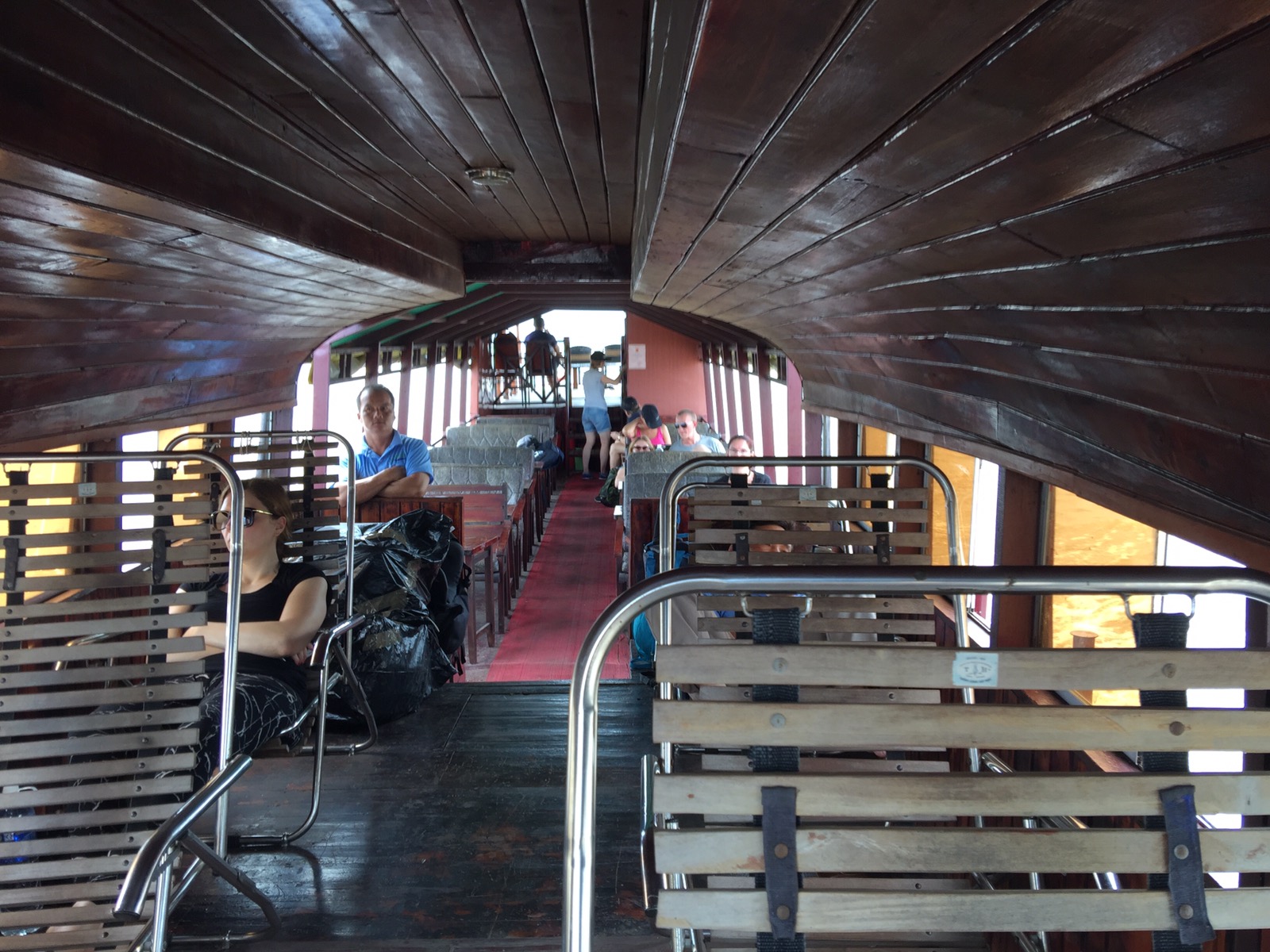 Unser neues Boot ist ein Expressboot. Hier sitzen wir leider in einer Kabine und bekommen wenig von der Außenwelt mit.