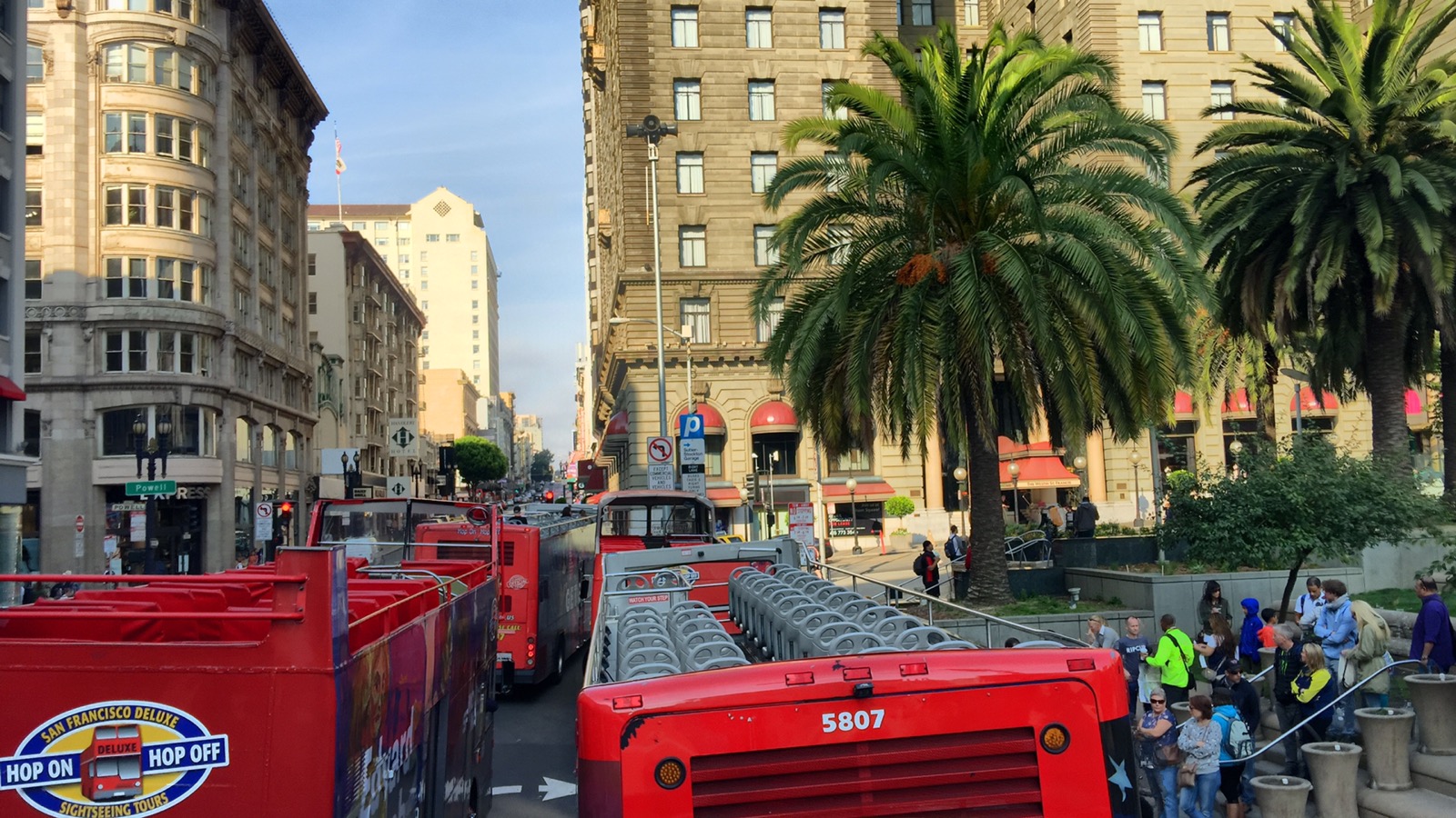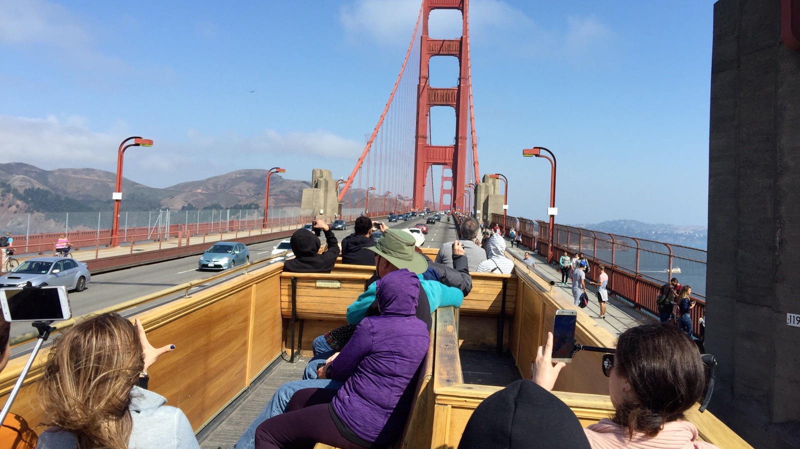 Es gibt hier mehrere Anbieter von Hop On Hop Off Bussen. Die 2 bekanntesten sind Big Bus und Gray Line. Der Big Bus war brechend voll und bei Gray Line wollte keiner einsteigen. Grübel. Welchen sollen wir nehmen? Warum ist der eine voll der andere nicht? Und die Ticketverkäufer redeten alle ununterbrochen auf uns ein. Wir haben uns entschlossen den leeren Bus zu nehmen. Die Touren sind ähnlich und ein Sitzplatz oben im Bus war auch wichtig. Kaum saßen wir im Bus, stiegen noch ein paar andere Leute zu und der Bus fuhr los. Das erste was wir festgestellt haben, San Francisco morgens um 9 Uhr im offenen Bus ist sau kalt. Der Tourbegleiter hat was von einem kalten Wind erzählt, der gerade von Alaska kommt. Es ist auch wirklich ungewöhnlich kalt für September. Zwischen 15 und 20 Grad hat es tagsüber und der Wind pfeift hier ganz schön um die Ecken.