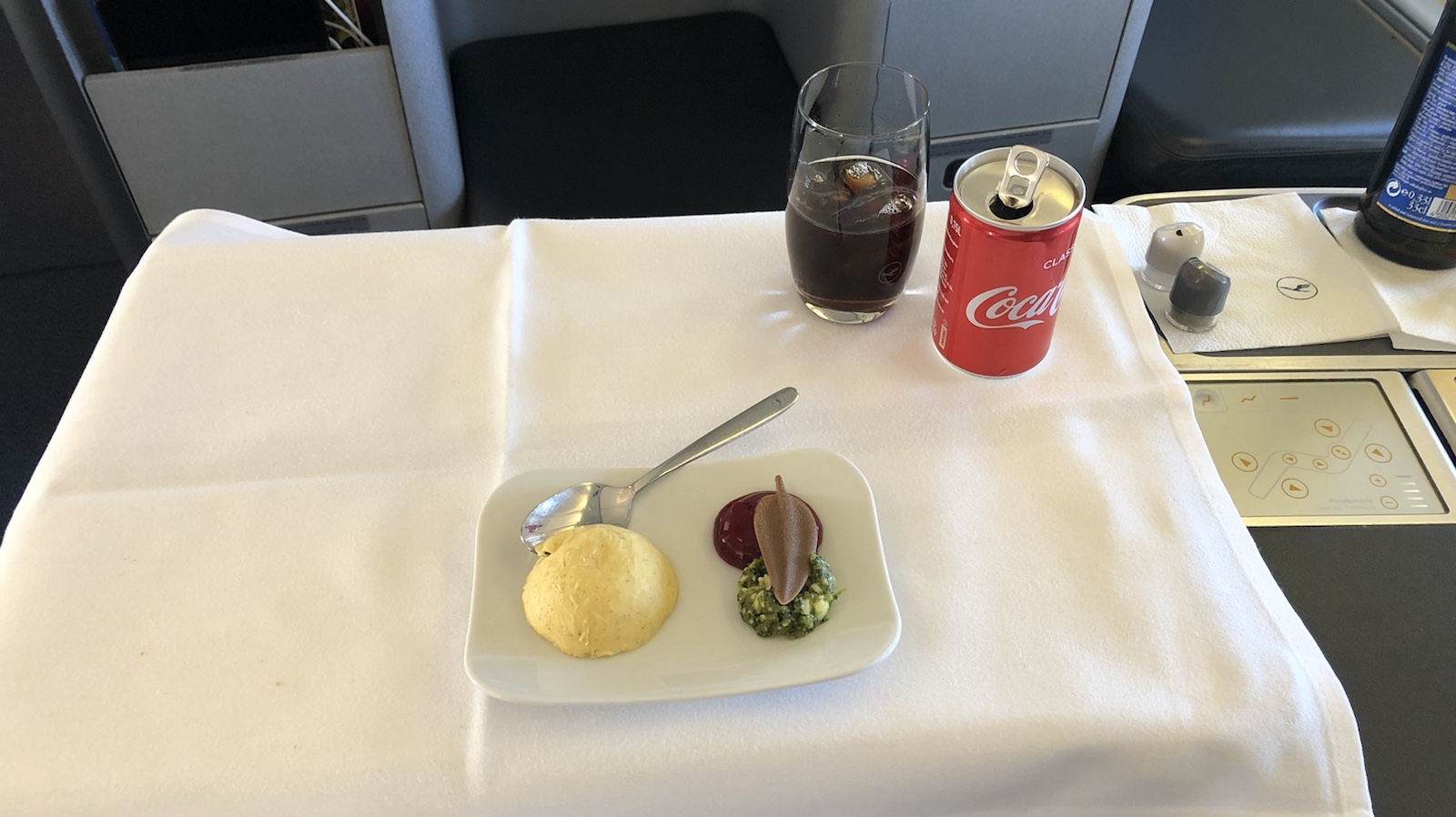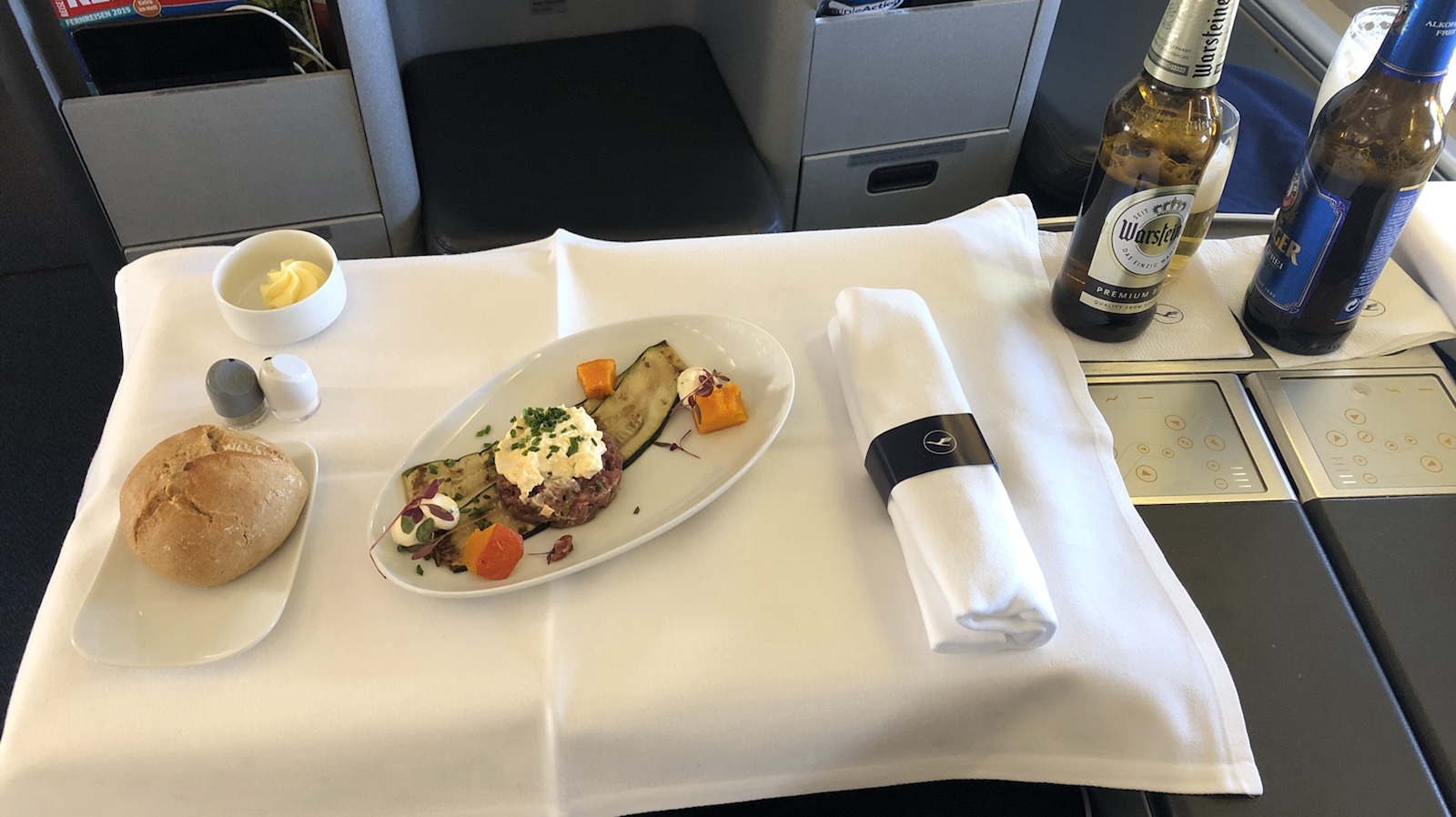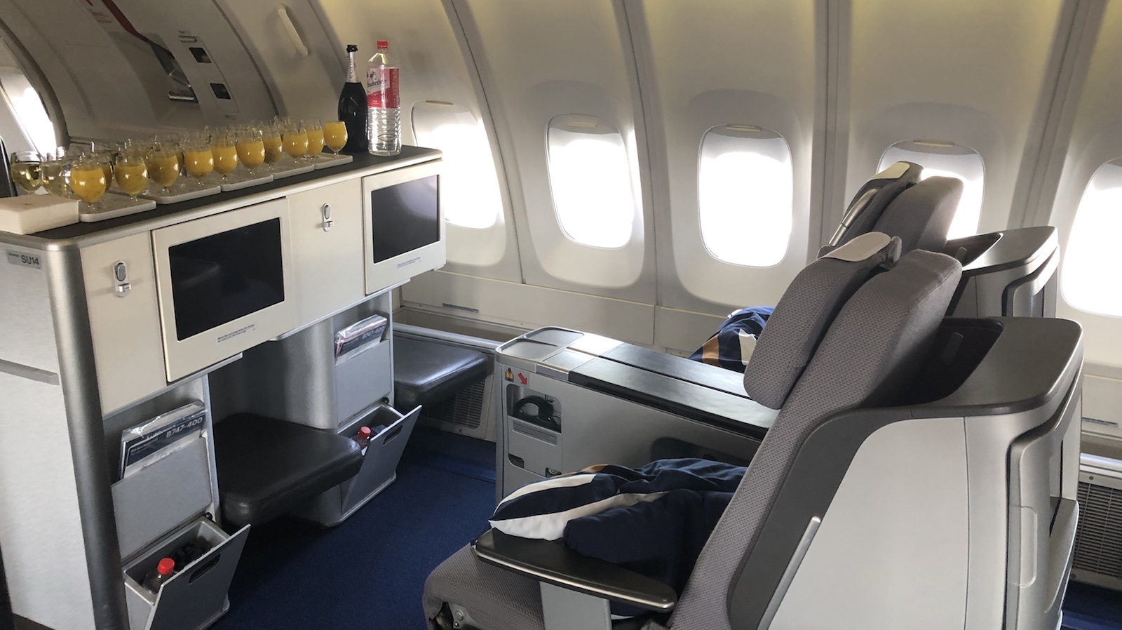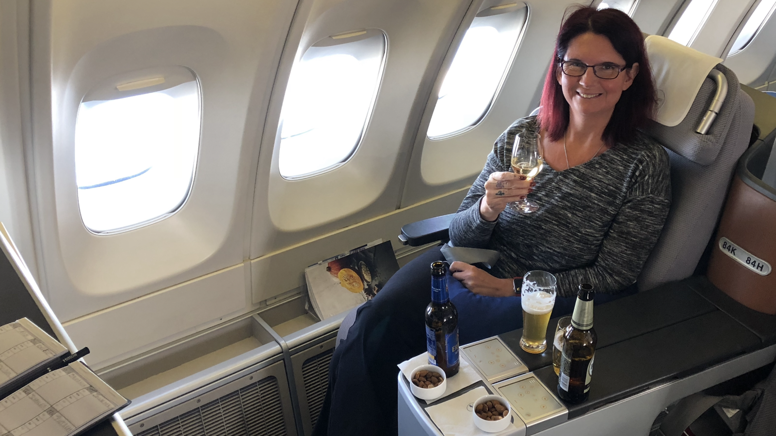 Nach dem Essen haben wir dann unsere Sitze in eine Fernsehsesselposition gebracht und haben einen Film geschaut. Die Kopfhörer von Bose haben Noisecanceling und einen super Klang. So verging dieser Flug relativ angenehm. Aber nach 10 Stunden will man auch aus der besten Businessklasse raus. So eineinhalb Stunden vor der Landung gab es noch ein kleines Essen. Champagner haben wir nur zum Anfang des Fluges getrunken. Wir müssen ja nach der Landung unser Auto noch holen.