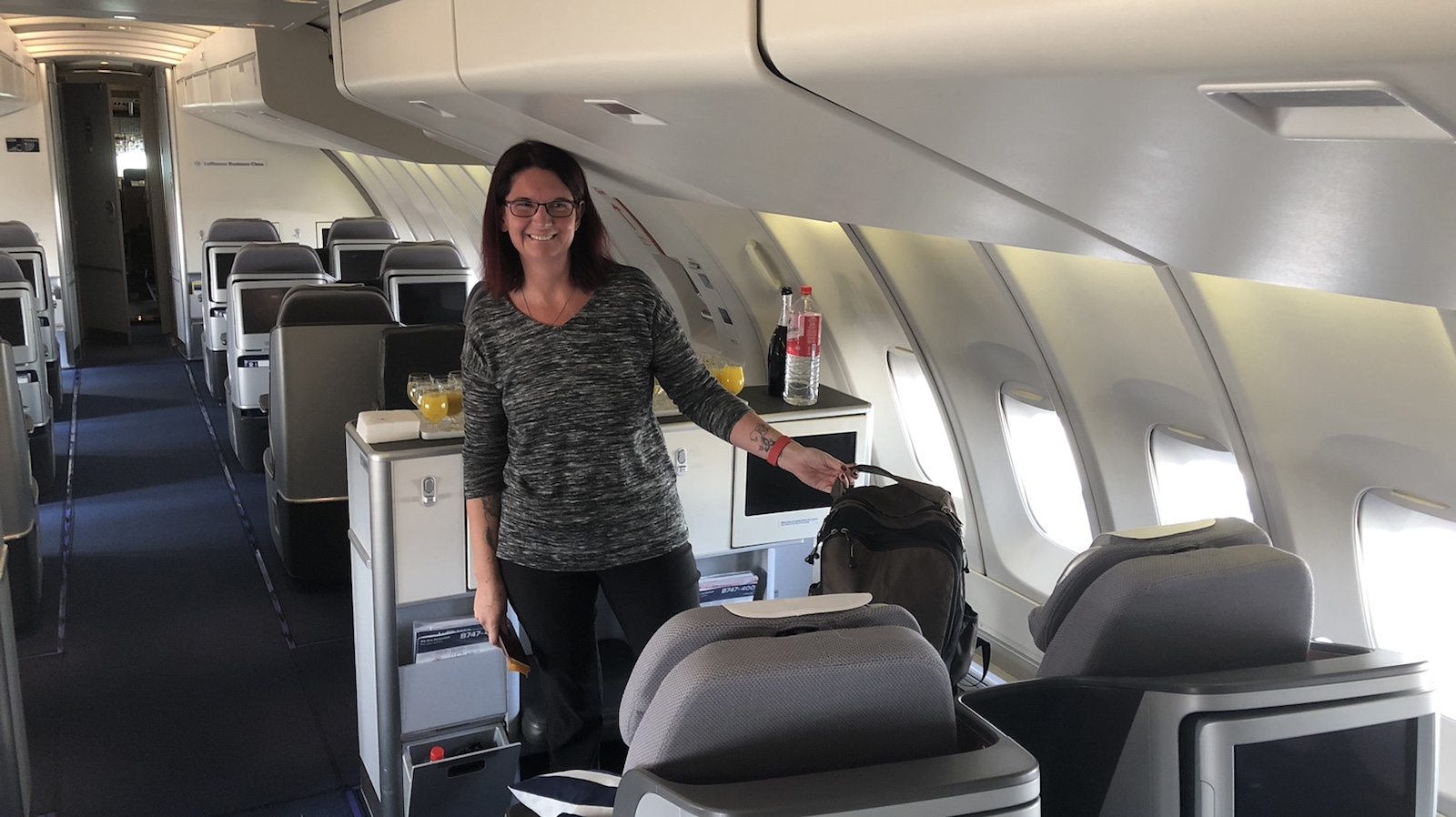 Eine Stunde vor dem geplante Abflug gingen wir zum Gate zum Boarding. Dort mussten wir aber noch fast eine halbe Stunde auf das Boarding warte. Wie üblich durfte die Businessklasse zuerst rein. Wir standen auch ziemlich vorne, sodass wir als erstes auf dem oberen Deck waren. Also Zeit ein paar Fotos zu machen.