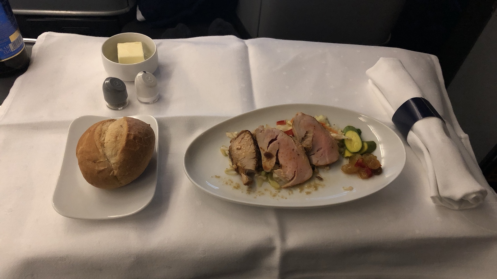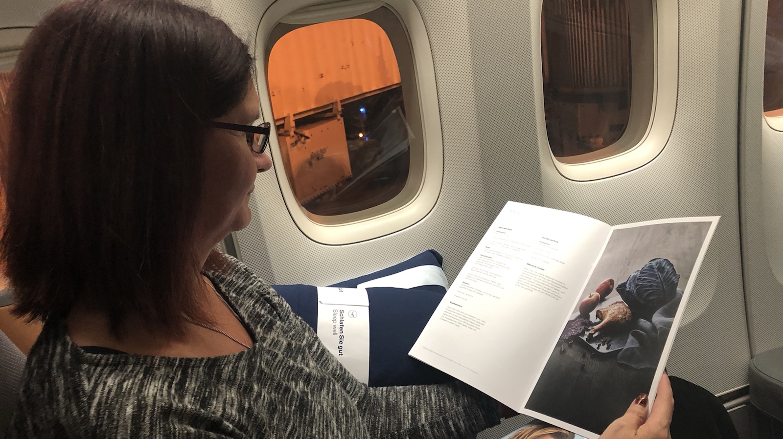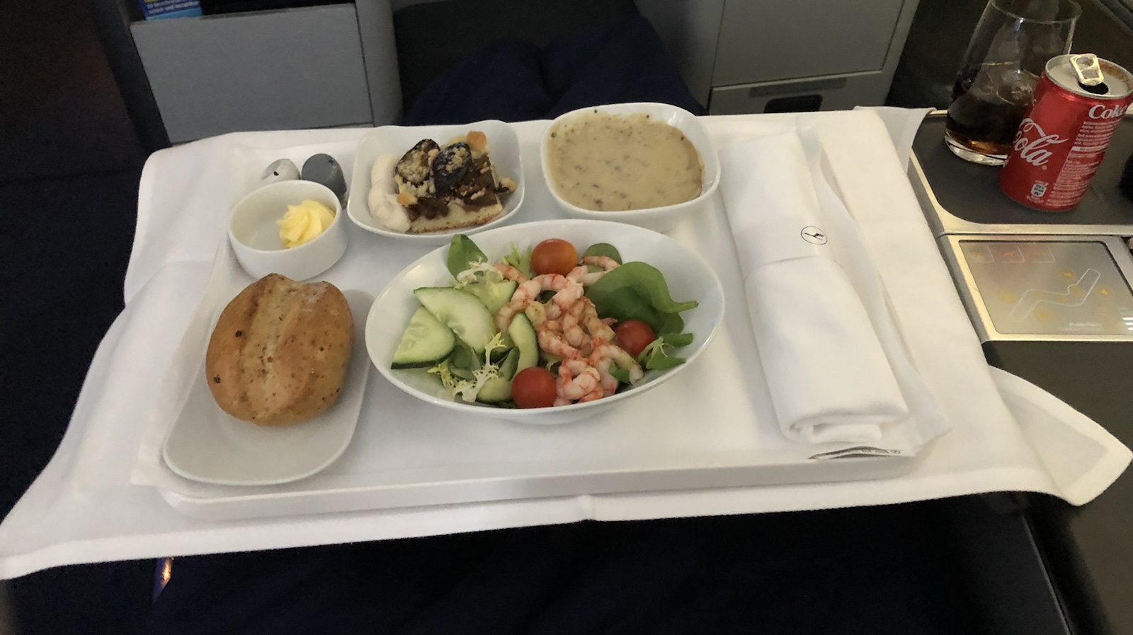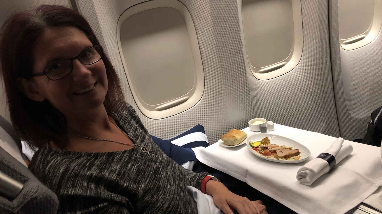 Wir wurden an unseren Sitzplätzen namentlich mit einem Handschlag von der Stewardess begrüßt. Dieses mal saßen wir unten. Oben war es gemütlicher. Auch war das Essen auf dem Hinflug bedeutend besser. Aber das war meckern auf hohem Niveau.
