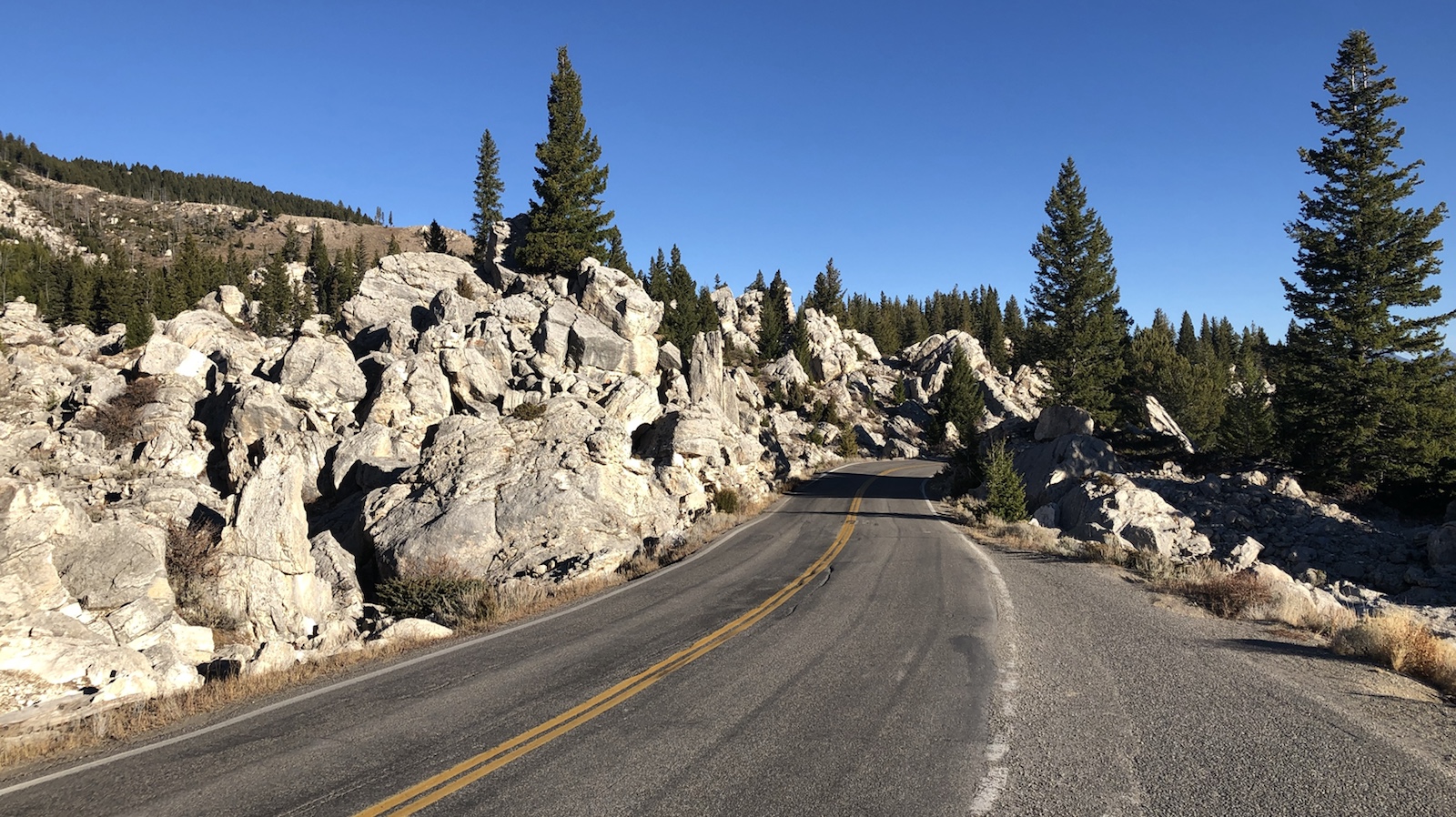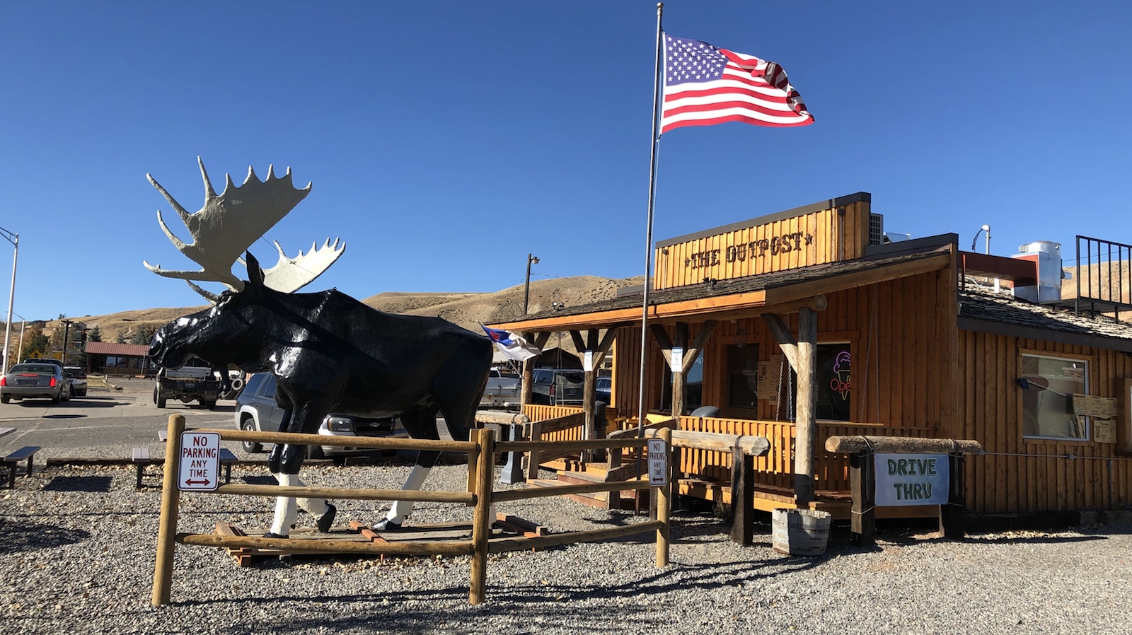 Im Hotel gibt es ab 5 Uhr Frühstück das für amerikanische Verhältnisse sogar recht gut war. Rühreier, gebratene Hackfleischscheiben und das übliche wie Donuts, Toast und Waffen. Die frühe Uhrzeit kommt uns sehr gelegen, weil wir so zeitig wie möglich los wollen. 700 Kilometer wollen wir heute fahren. Der Ort den wir erreichen wollen heißt Dubois und liegt in der Nähe zum Grand Teton NP und durch diesen müssen wir fahren um zum Southgate des Yellowstone NP zu kommen. Aber erst einmal von Denver nach Dubois in Wyoming. Durch Denver durch fanden wir schlimmer als durch Los Angeles. In Los Angeles war mehr Verkehr aber deshalb wurde langsamer gefahren. Durch Denver im morgendlichen Berufsverkehr mussten wir die hohe Geschwindigkeit mithalten sonst hätten die uns überrollt. Aber gleichzeitig wollten wir uns so gut wie es ging and die Höchstgeschwindigkeit halten. Nach 45 Minuten waren wir durch und sind im ruhigeren Verkehr weiter gefahren. Als um 7 Uhr die Sonne aufging, sind wir in die Berge reingefahren und kurze Zeit später war die Straße weg. Jedenfalls der Fahrbahnbelag. Eigentlich dürfen wir mit dem Leihwagen keine Dirty Road’s fahren. Aber was sollen wir machen. War keine andere Straße da. Nach ungefähr 10 Kilometer war dann aber alles wieder gut.