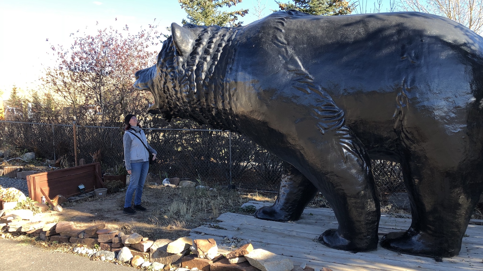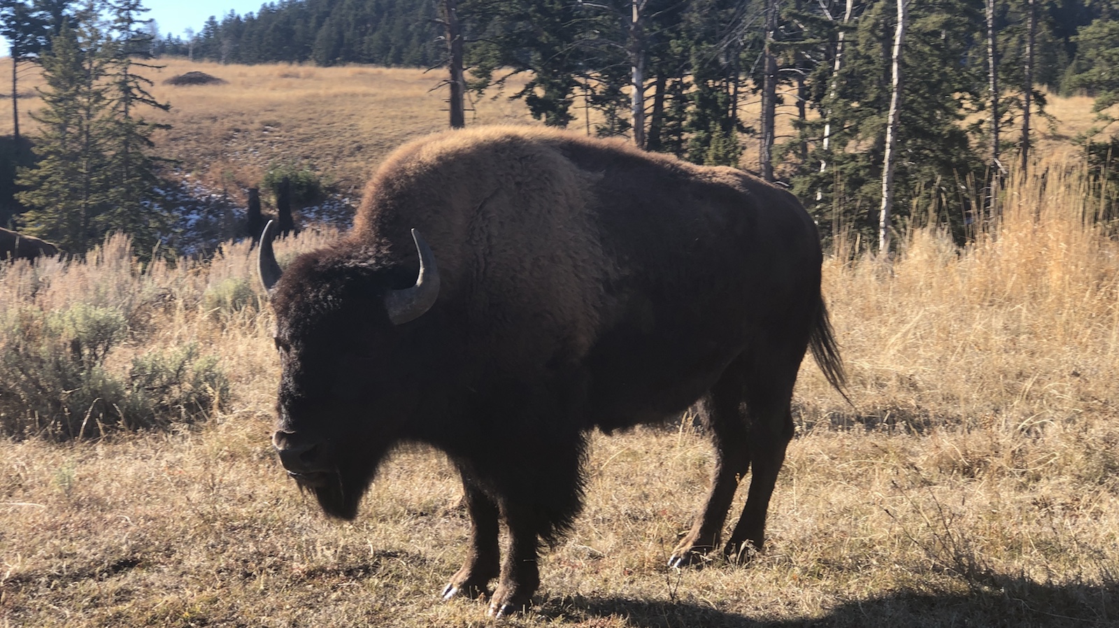 Wir haben so viele Bisons gesehen, dass wir zum Schluss nur noch langsam vorbei gefahren sind. An einer Stelle neben der Straße standen viele Leute und haben mit Ferngläser und Fernrohre in die Prärie geschaut. Wir haben nix gesehen. Ein älteres Ehepaar hat uns dann erlaubt, durch ihre Fernrohre zu gucken. Da haben wir das Wolfsrudel auch gesehen. Bären haben wir aber nicht gesehen. Schade, aber die Natur hält sich nicht immer an unsere Pläne.