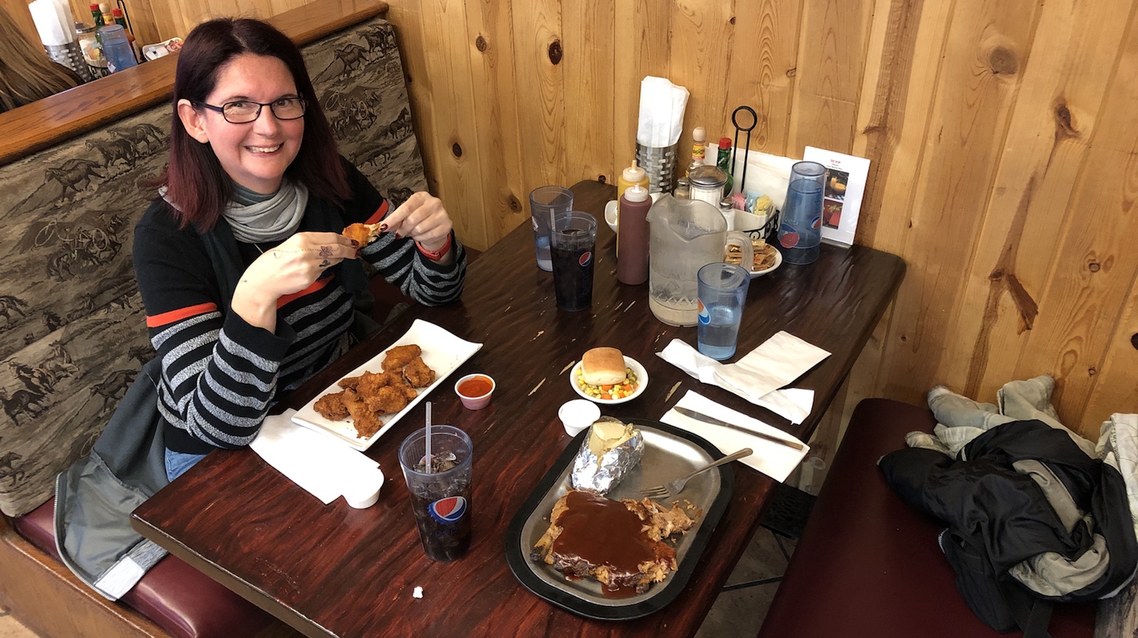 Dieses Diner scheint im Ort sehr beliebt zu sein. Es saßen auch viele Einheimische drin. Ein Mann mittleren Alters stand auf um sich was zu holen und ich musste zweimal hinschauen. Echt der Cowboy. Der hatte doch wirklich ein Halfter mit einer Pistole drin. Wyoming, Land der Cowboys.