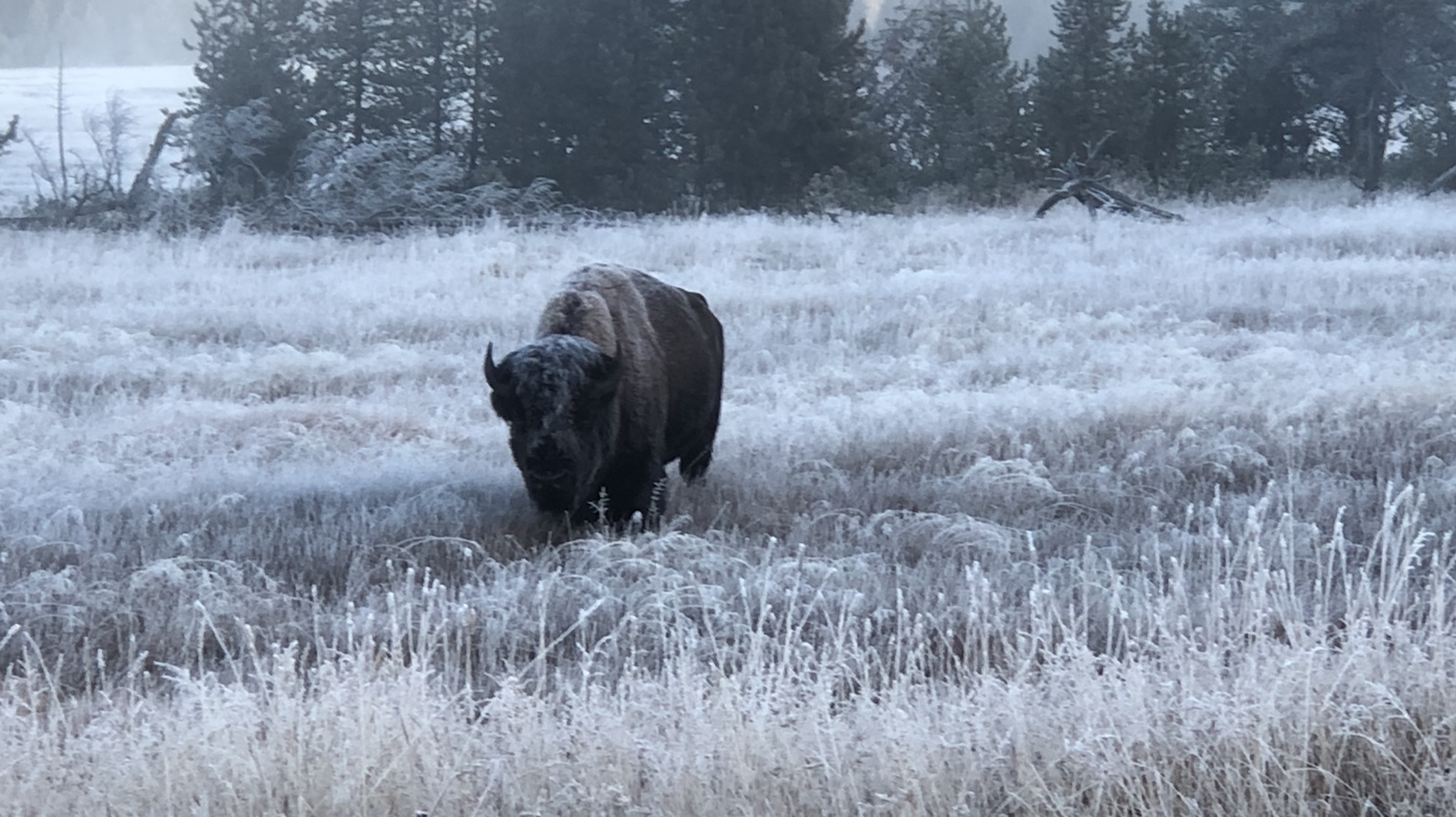 Ein Bison im morgendlichen Frost.