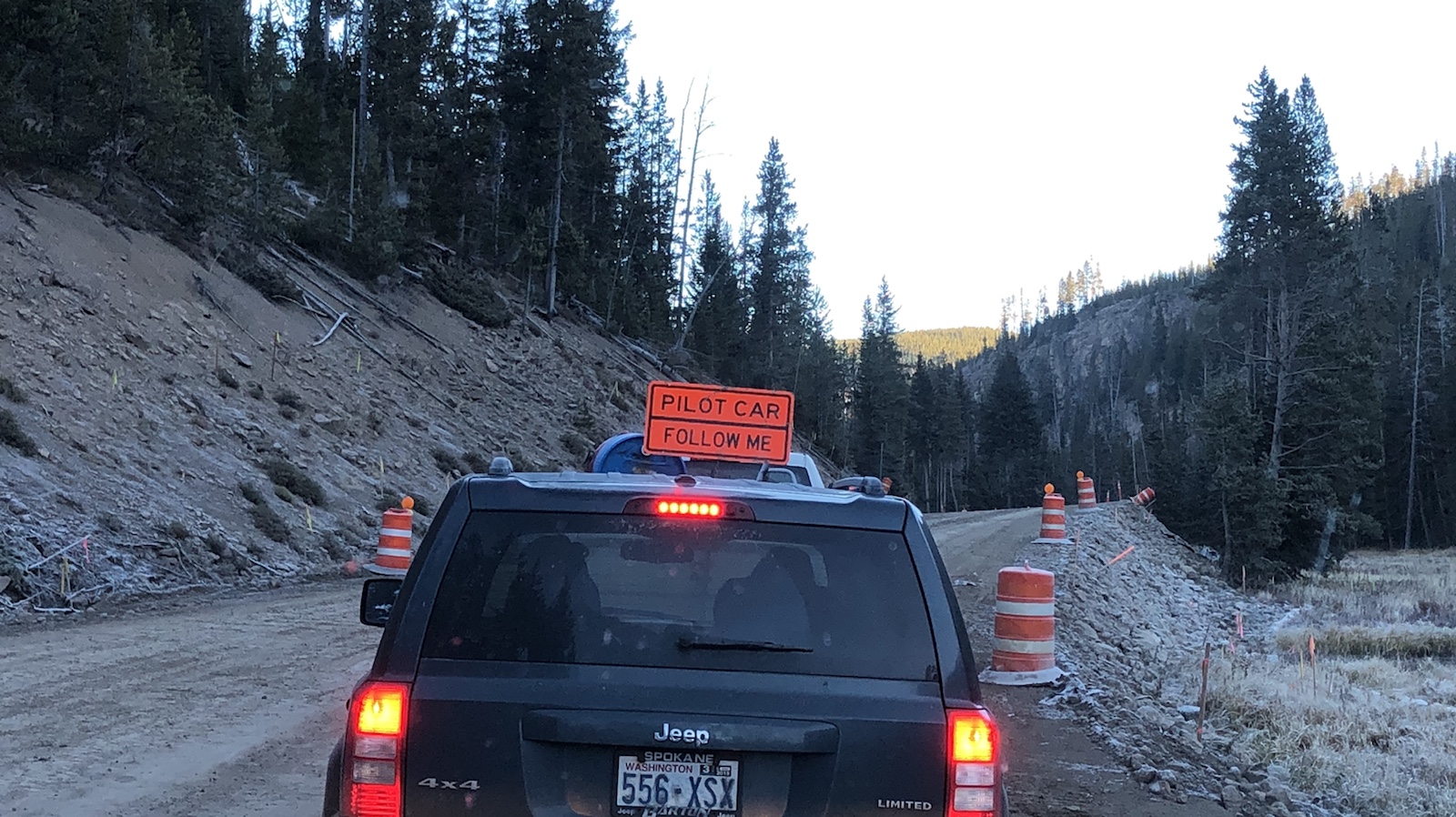 Um 6 Uhr gab es ein typisch amerikanisches Frühstück in diesem lauten Hotel. Das Haus ist so hellhörig, als ob die Wände aus Papier wären. Um 7 Uhr, mit dem Hell werden sind wir zu unserer zweiten Tour in den Nationalpark aufgebrochen. Dieses mal soll es in den nördlichen Teil gehen. Gestern waren wir nur im südlichen Teil. Nach circa 30 Meilen sind wir an eine Baustelle angekommen. Die Straße wurde neu gemacht. Anders als bei uns, wird das hier nicht mit einer Ampel geregelt. Es steht jemand mit einem Stoppschild an der Straße. Nach circa 20 Minuten kam von vorne der Gegenverkehr, angeführt von einem Safety Car. Dieses Auto hat sich dann vor uns eingereiht um uns durch die Baustelle zu bringen. Hat auch ganz gut geklappt.