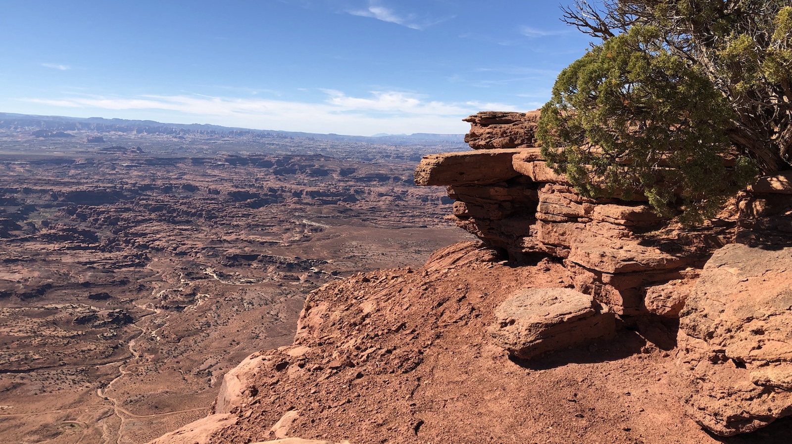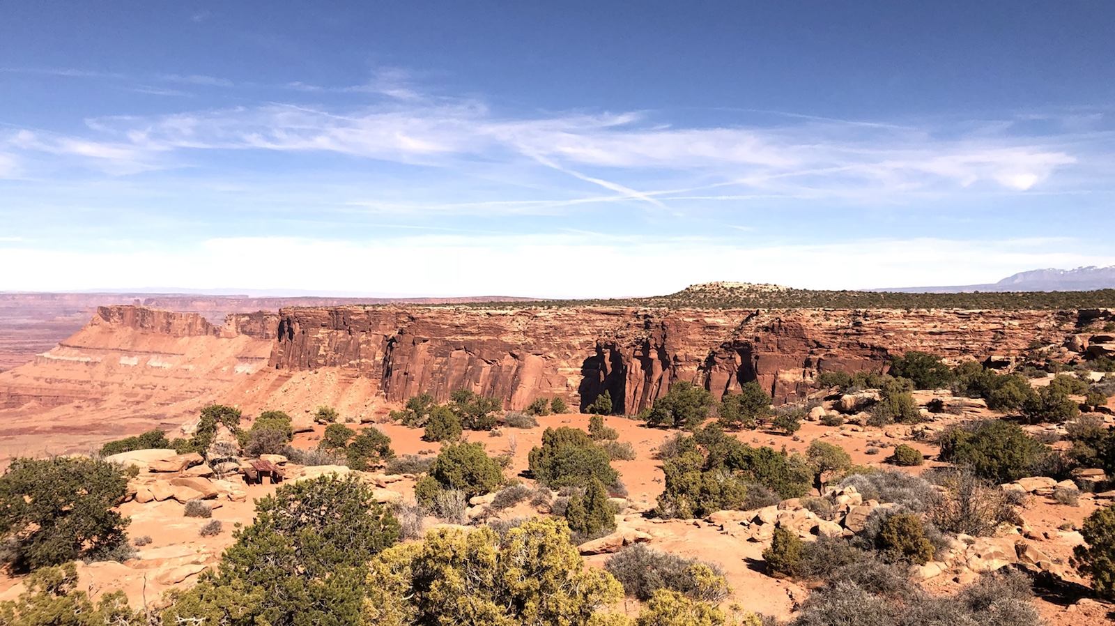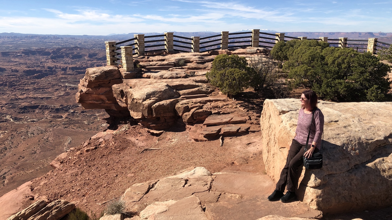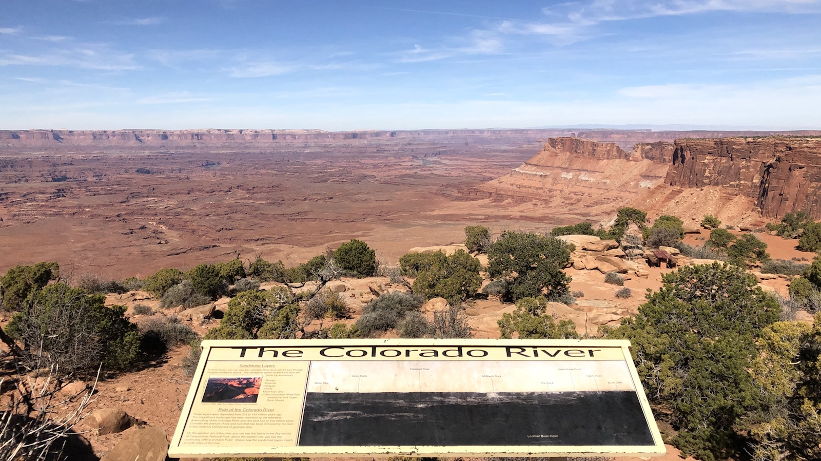Nach Moab kommt ein interessanter Overview, den viele gar nicht auf dem Programm haben. Den Needles Overview. Die Straße dort hin ist zwar befestigt aber recht schmal. Nach 20 Meilen erreicht man einen sehr schön gestalteten Rastplatz mit einen tollen Ausblick auf die Canyon Lands.