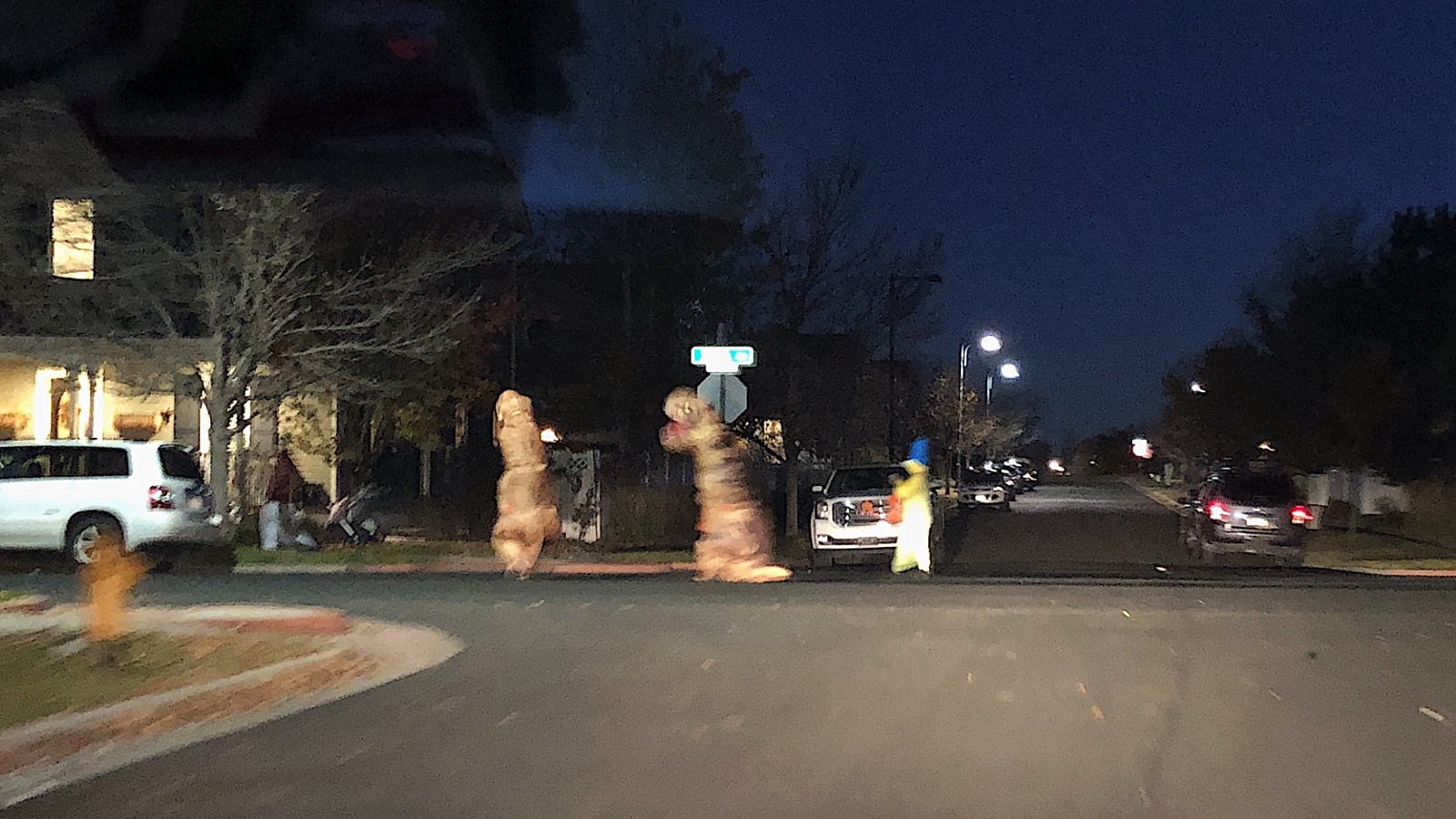 Als es dunkel wurde, sind wir dann mit dem Auto durch ein Wohngebiet gefahren. So viele Monster und Hexen wie da haben wir noch nirgends auf einmal gesehen. Leider war auf Grund der Dunkelheit eine fotografische Dokumentation nicht möglich. Aber in einem unaufmerksamen Augenblick als auch ein wenig Licht war und uns die Monster nicht beobachtet haben, konnten wir einen unscharfen Schnappschuss machen.