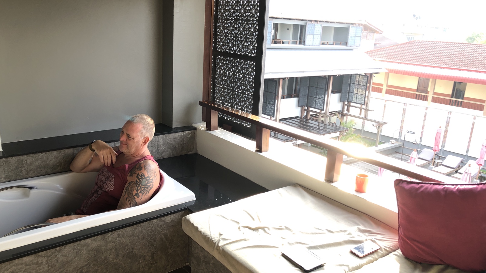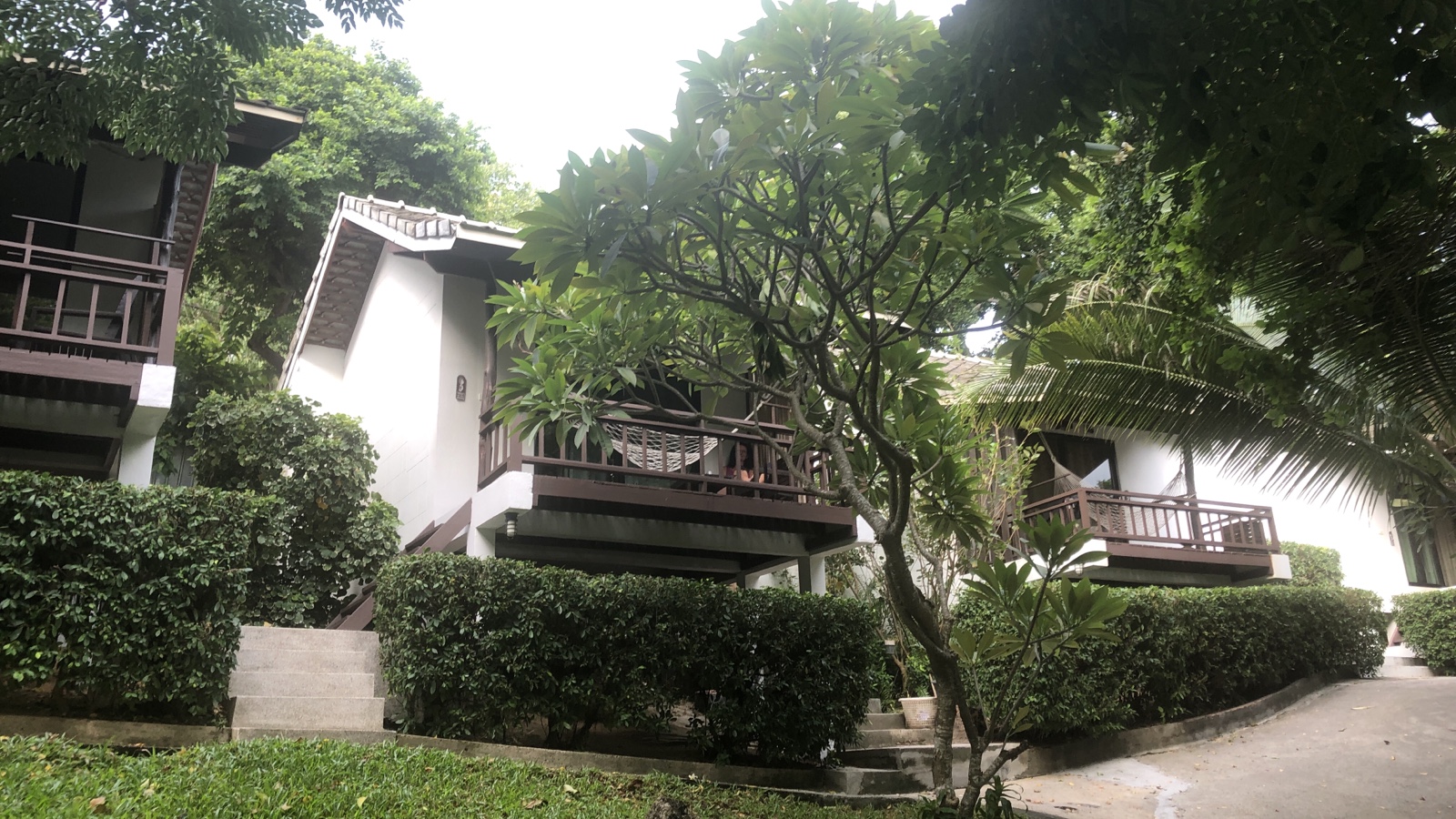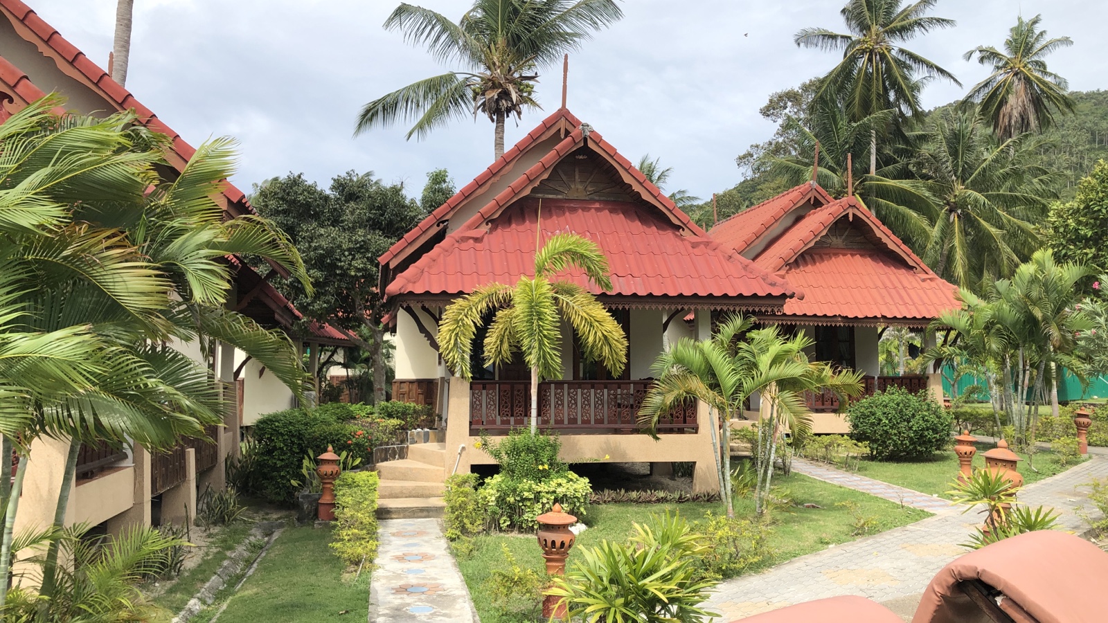 Die Bungalowanlage des Longbay Resort ist wirklich gut. Unser Bungalow gefällt uns auch aber das Bett ist ne Katastrophe. Beim testen der Härte der Matratze hat man es gar nicht gemerkt. Es kam einen weich vor, da beim runter drücken der Matratze es gleich nachgegeben hat. Aber wenn man auf dem Bett liegt, liegt man wie auf einem Brett, dass federnd gelagert ist. Nach der ersten Nacht haben wir überlegt wieder abzureisen. Gerade ich, Tommy, merke die harte Matratze. Aber nee. Man weiß, das in Thailand die Matratzen härter sein können. Da muss ich jetzt durch. Der Rest hier am Beach stimmt ja.