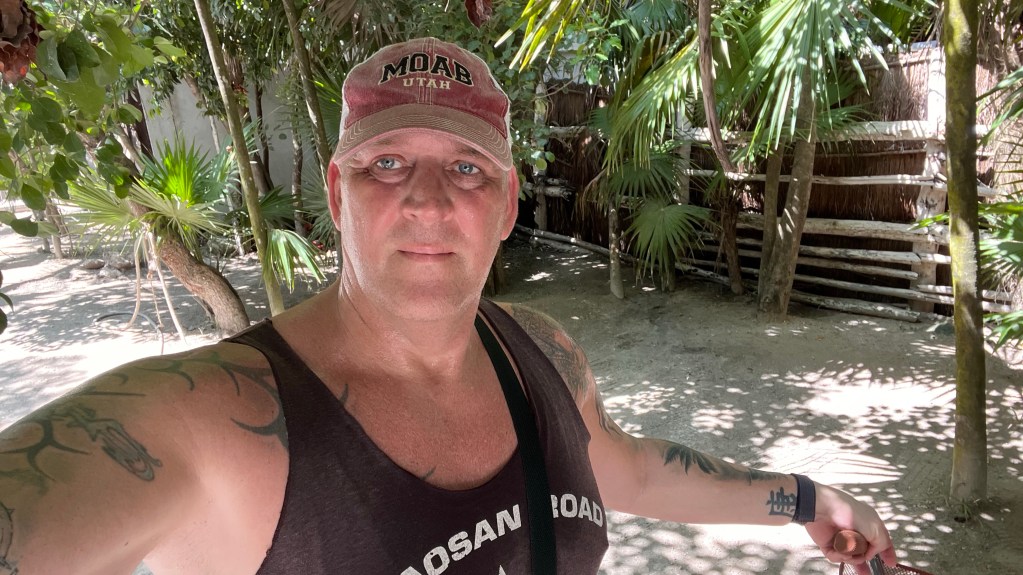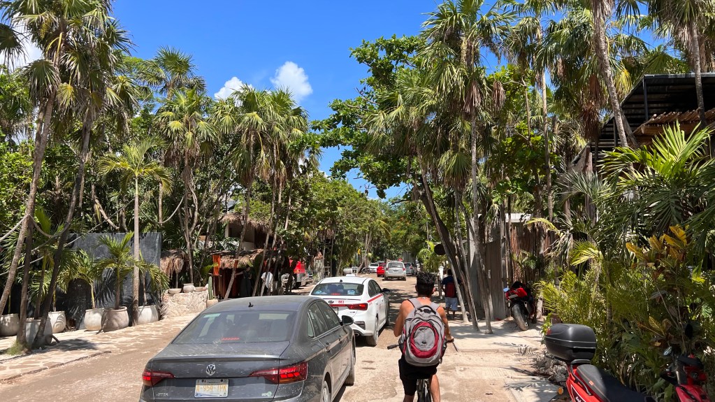 9.10.2021 Wir sind in Tulum Stadt. Dieser Ort, Richtigerweise Tulum Beach, wird gerade voll gehypt. Wir wissen nicht warum. Der Weg zum Beach führt über eine 5km lange Straße, die teilweise nicht mehr befestigt ist. Auf dieser drängen sich LKW‘s, Autos, Mopeds, Fahrräder und Fußgänger. Alles ist staubig und laut. Den Strand sieht man nicht. Dazu muss man sich für mehrere 100€/Tag, kann auch über Tausend pro Tag werden, ein Zimmer oder Bungalow mieten. In Thailand zahlt man für Bambus-Bungalows ohne Klimaanlage 30-50€ pro Nacht. Hier wir das als besonders Hip für das zehnfache Verkauft.