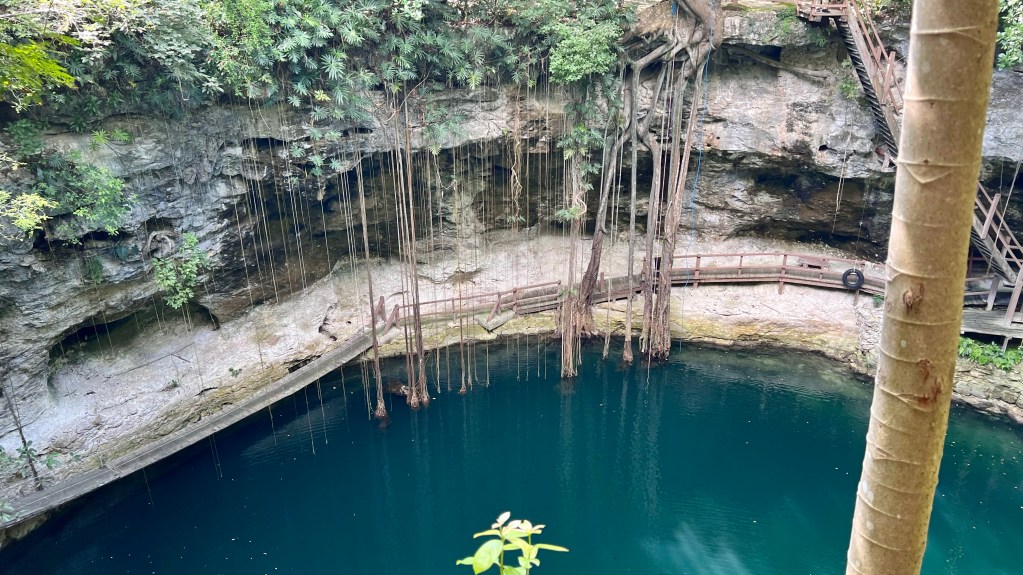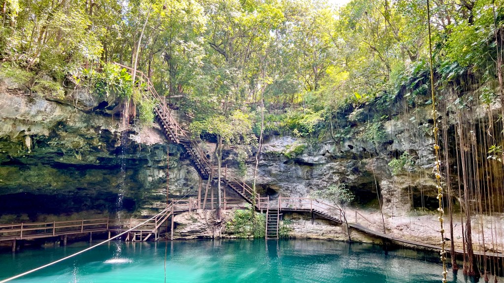 Infobox: Der Eintritt in die Cenote ist in dem vollkommen überteuerten Eintritt in die Ruinenanlage nicht enthalten. Für Ausländer kostet der Eintritt circa 450 Pesos pro Personen, da die Regierung von Ausländern eine Sondersteuer verlangt. Einheimische zahlen weniger als die Hälfte. Die Cenote kostet dann noch mal 170 Pesos pro Personen. 23 Pesos = 1€
