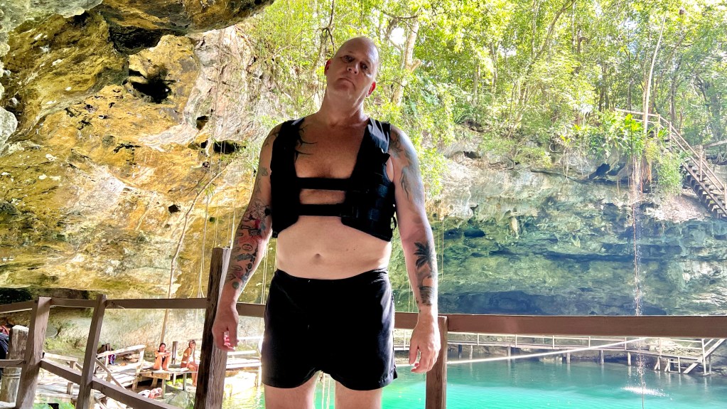 Das Pyramiden Hoch und Runter war ganz schön anstrengend. Gut das die Mayas eine hauseigene Cenote hatten. Die ist 3km entfernt und der Driver hat uns Ruck-Zuck dort hin gebracht. Das kalte Wasser tat richtig gut.