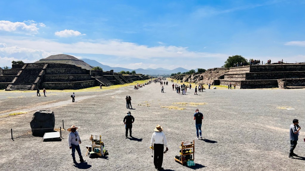 19.10.2021 Heute haben wir was gemacht, was wir sonst nie machen. Eine geführte Touristentour. Wir, das heißt ich, der Tommy, wollte zur aztekischen Pyramide Teotihuacán. Diese ist circa 50 Kilometer vom Mexiko City entfernt. Aber wie hinkommen? Im Internet findet man Beschreibungen, wie man mit öffentlichen Verkehrsmitteln hinkommt. Dies war uns erstens zu umständlich und zweitens haben wir gelesen, das der Bus ab und an überfallen wird. Ein Taxi war uns zu teuer. Also mit dem offiziellen Touristenbus mit Reisegruppe und Guide. Die Tour hat pro Personen 34€ gekostet und sollte von 9 Uhr bis 18 Uhr dauern. Was uns gleich komisch vorkam, warum so lange für die 50 Kilometer? Wir sollten es bald erfahren. Nach eine Stunde Fahrt, Stopp bei einer Verkaufsveranstaltung für über eineinhalb Stunden. Pünktlich zur Mittagszeit, sind wir dann bei den Pyramiden gewesen. Da mussten wir feststellen, dass wir den wohl schlechtesten Guide aller Zeiten hatten. Er hat ein super schnelles Spenglisch mit sehr schlechter Aussprache gesprochen. Wir mussten immer mehrmals nachfragen was er gesagt hatte. Niemand in der Gruppe hatte ihn verstanden. Selbst die spanisch sprechenden Leute haben sein Spanisch kaum verstanden.