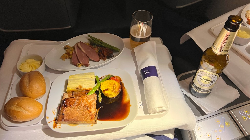 Eine Stunde vor der geplanten Abflugzeit sind wir dann zum Gate gegangen. Eine halbe Stunde später saßen wir in der oberen Etage der 747-800. Doch bis zum Start verging über eine weitere Stunde. Es haben noch Passagiere gefehlt. Außerdem gab es nicht mal ein Begrüßungscocktail. Laut Aussage des Steward, hat der Caterer die Cocktails vergessen. Dafür gab es nach dem Start dann Champagner. Auch die Mahlzeiten waren für ein Flugzeugessen hervorragend.