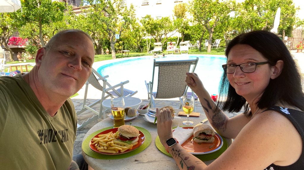 Bis Florenz sind wir gekommen. Länger wie 17 Uhr wollte ich nicht fahren. Wir wollten irgendwo von der Autobahn abfahren und uns einen schnuckligen Ort für die Übernachtung suchen. Es gab aber keine Abfahrten und keine Orte. Nur Tunnel. Einer nach dem anderen. Bis Florenz. Zum Glück kam ich auf die Idee nach einem Hilton zu suchen. Und wirklich, nahe der Autobahn gab es ein Garden Inn. Der Vorort war nicht das, wie man sich Italien vorstellt. Ganz normale Großstadt. Und was zum Essen zu finden war schwieriger als gedacht. Die Gastronomie war zwar offen aber nur im TakeAway oder außen Sitzen. Wir haben einen Imbiss gefunden, der draußen Stühle hatte. Wir hoffen, das es an der Amalfiküste besser wird.