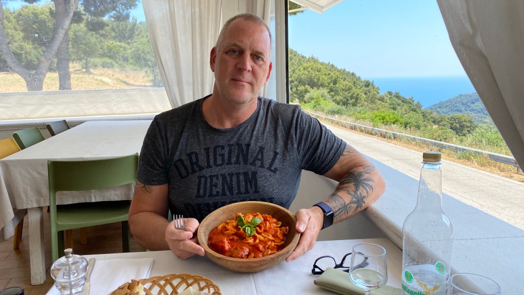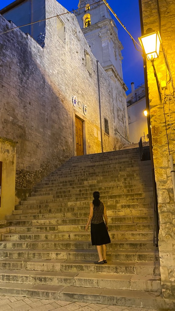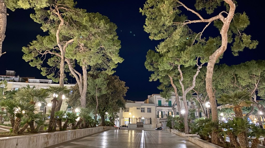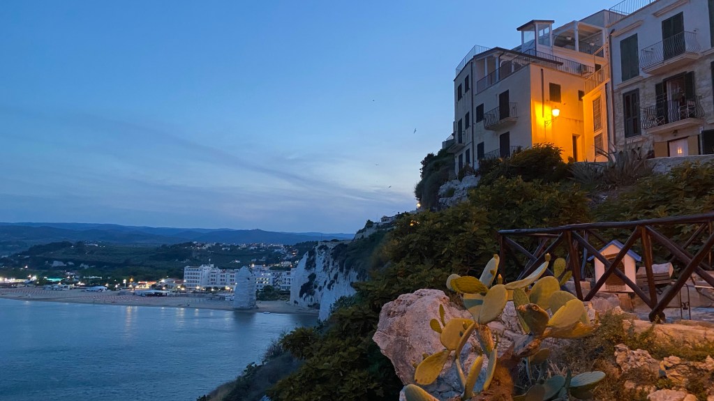 Heute Morgen haben wir, in der Hoffnung, das die Kupplung noch intakt ist, vom Angestellten des Hotels unser Auto zur Straße fahren lassen. Alles gut. Wir konnten unsere 320 km Reise nach Vieste antreten. Die Fahrt war ereignislos. Aber schon bald nach Ankunft auf dieser „Halbinsel“, haben wir gemerkt, das es hier auch sehr schön ist. Und nach einem Zwischenstop in einem Restaurant auf einem idyllischen Berg, haben wir gemerkt, das Essen in Italien nicht teuer sein muss.