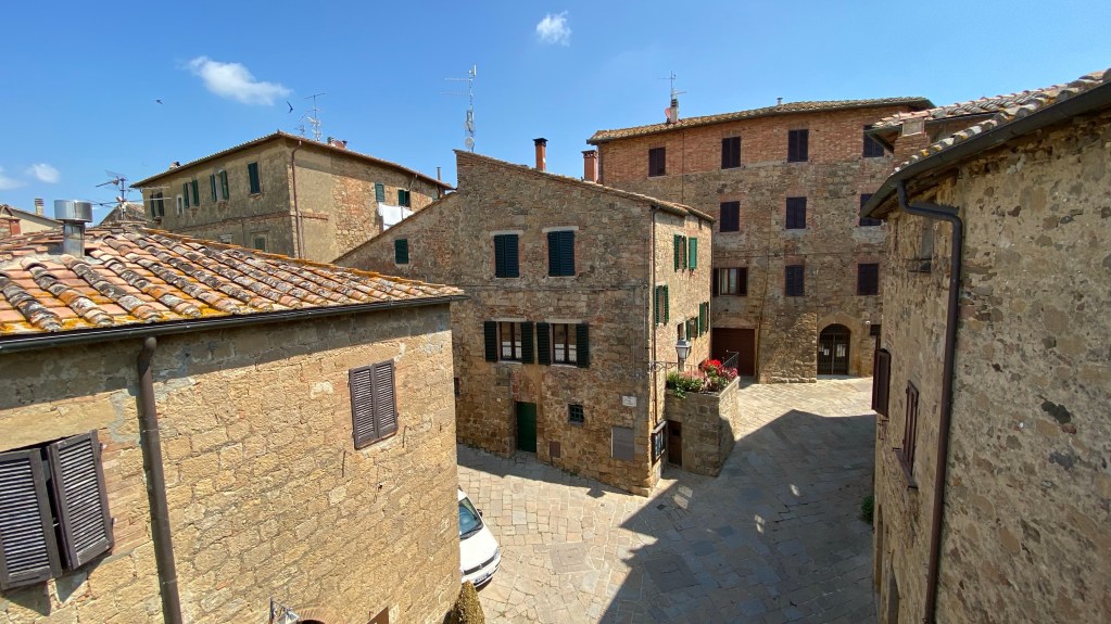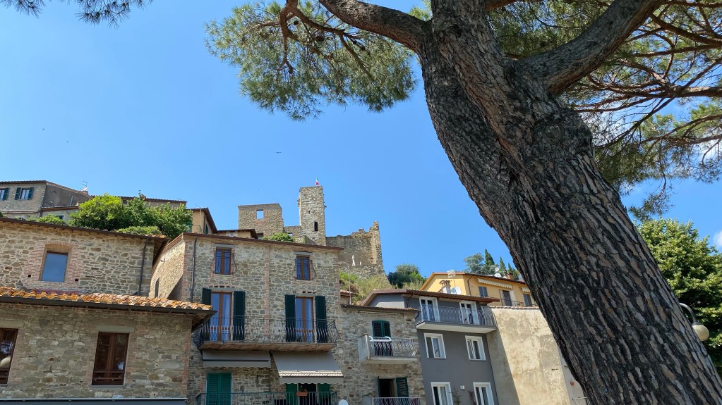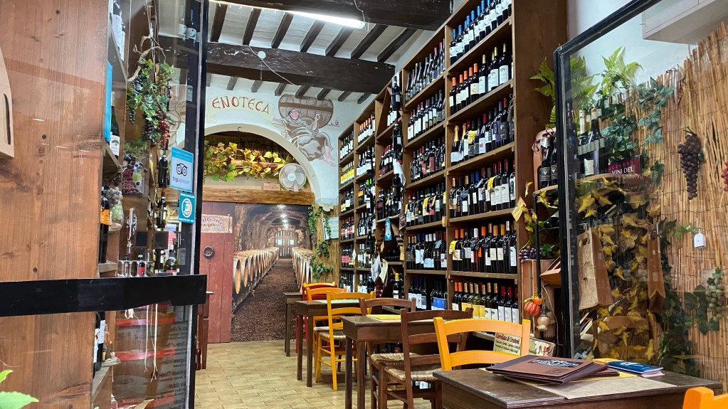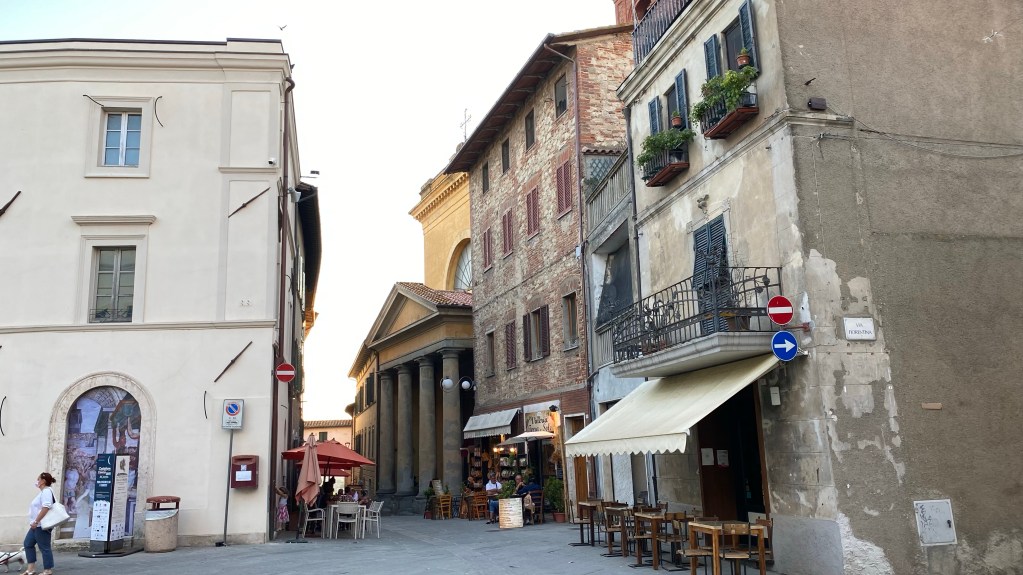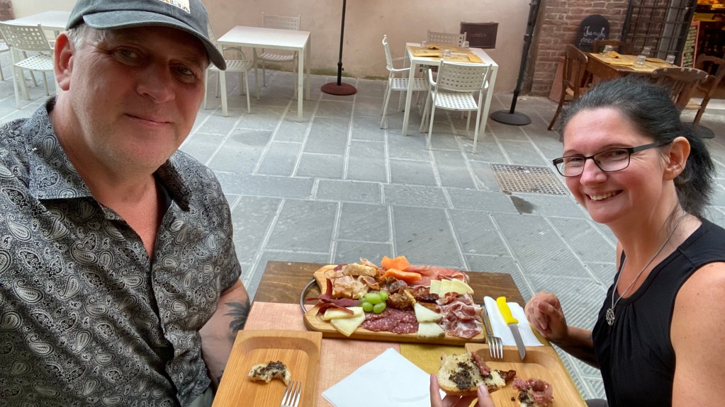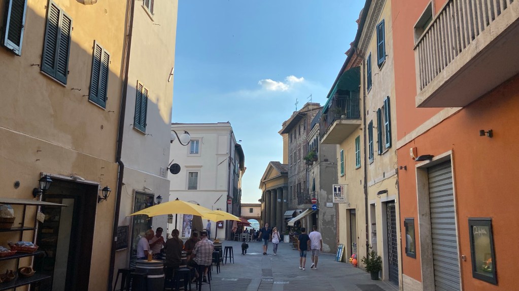 Der Ort Castiglione del Lago liegt noch in Umbrien, direkt an der Grenze zur Toskana. Umbrien ist bekannt für seine Ursprünglichkeit und der herzhaften Küche. Es gibt viele Läden, die den Wein aus der Umgebung verkaufen und gleichzeitig ein paar Tische und Stühle vor der Tür zu stehen haben. Hier kann man gemütlich ein Wein trinken und Schinken und Salami aus der Region probieren. Als Spezialität gibt es Schinken vom Wildschwein. Auch wir konnten nicht wieder stehen.
