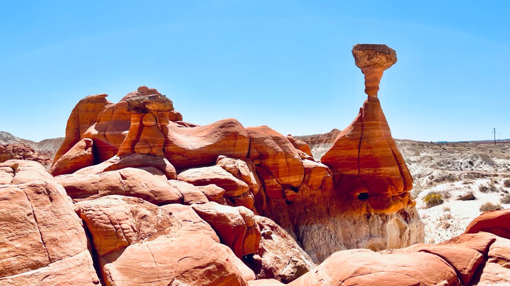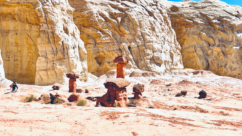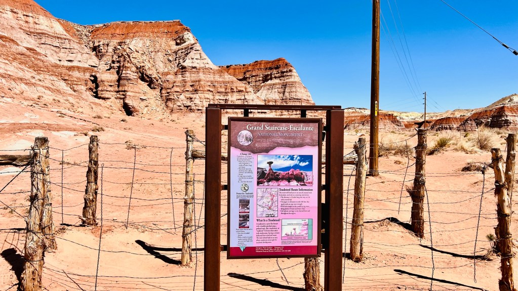 Außerdem findet man nach 47 Kilometern den Eingang zum Toadstool Hoodoos Trailhead. Viel Infos findet man dazu nicht. Ich habe nur ein Foto bei Google Maps gesehen und dache, das sieht so verrückt aus, dass muss man mal genauer angucken. Der Parkplatz zum Eingang des 1,5 Kilometer langen Wanderwegs ist direkt an der Straße.