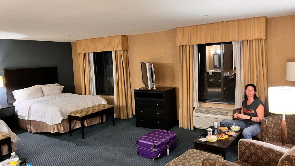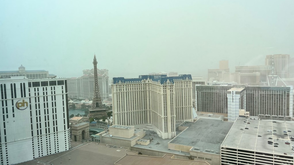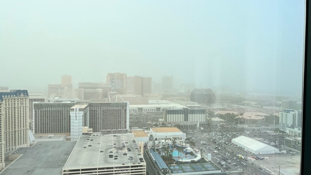 Man sollte rechts ran fahren und mit dem Fuß auf der Bremse bleiben. Außerdem sagte die Stimme der Meldung „stay alive“. OK, hört sich ernst an. Alle anderen Autos fuhren auch weiter. Alle etwas langsamer aber sie fuhren. Außerdem galt die Warnung für in 1,5 Stunden. Wir hatten noch 30 Minuten bis zum Hotel. So fuhren wir mit erhöhter Aufmerksamkeit weiter und erreichten wohlbehalten das Parkhaus des Hotels. Von unserem Zimmer konnten wir nicht mehr zu den Bergen gucken. Nur die nächsten Hotels waren noch zu sehen.