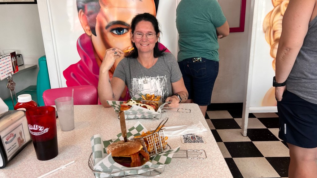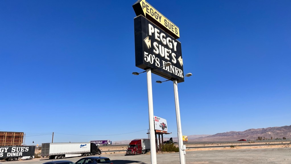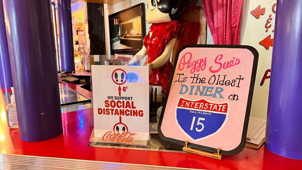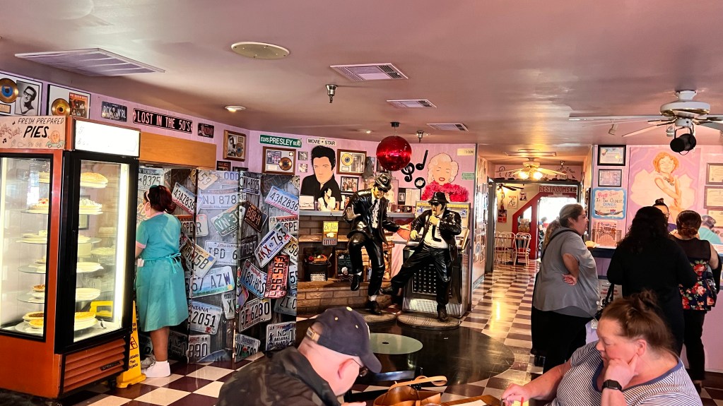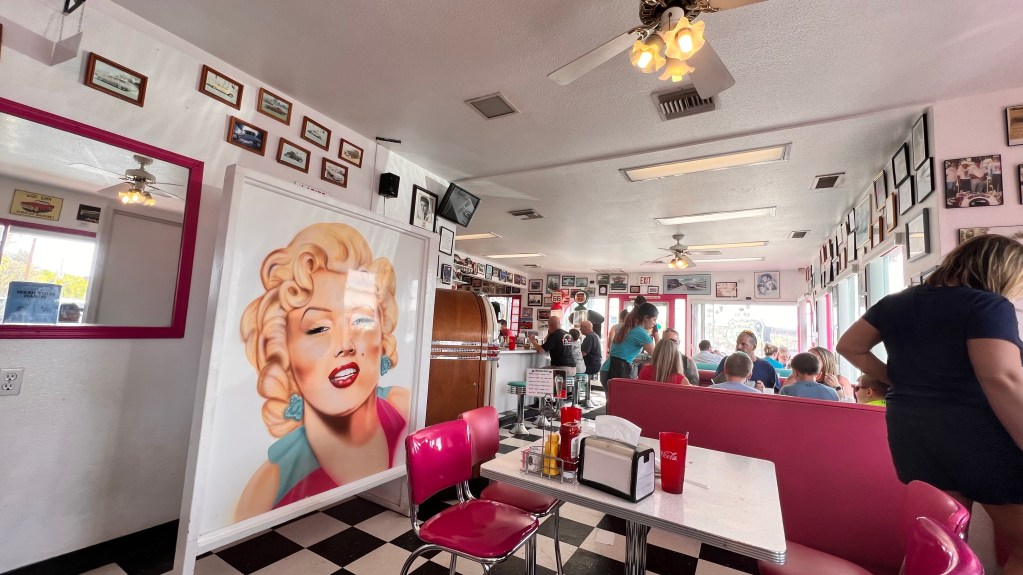 Nach ungefähr ein Drittel der Strecke, sieht man am Straßenrand die Werbung von Peggy Sue‘s 50er Jahre Diner. Da mussten wir natürlich anhalten.