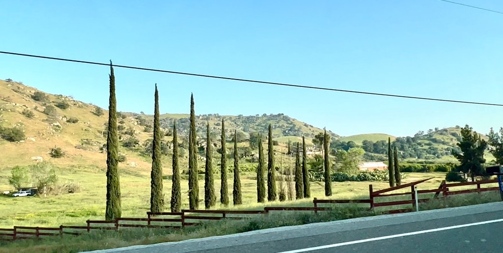 Die letzten 50 km bis zum Eingang des Sequoia NP sehen teilweise aus wie die Toskana. Wir haben uns gefragt, ob wir einen Zeitsprung zurück in Frühjahr 2021, als wir in der Toskana waren, gemacht haben.