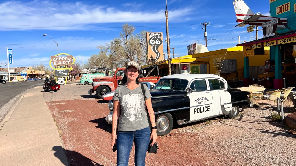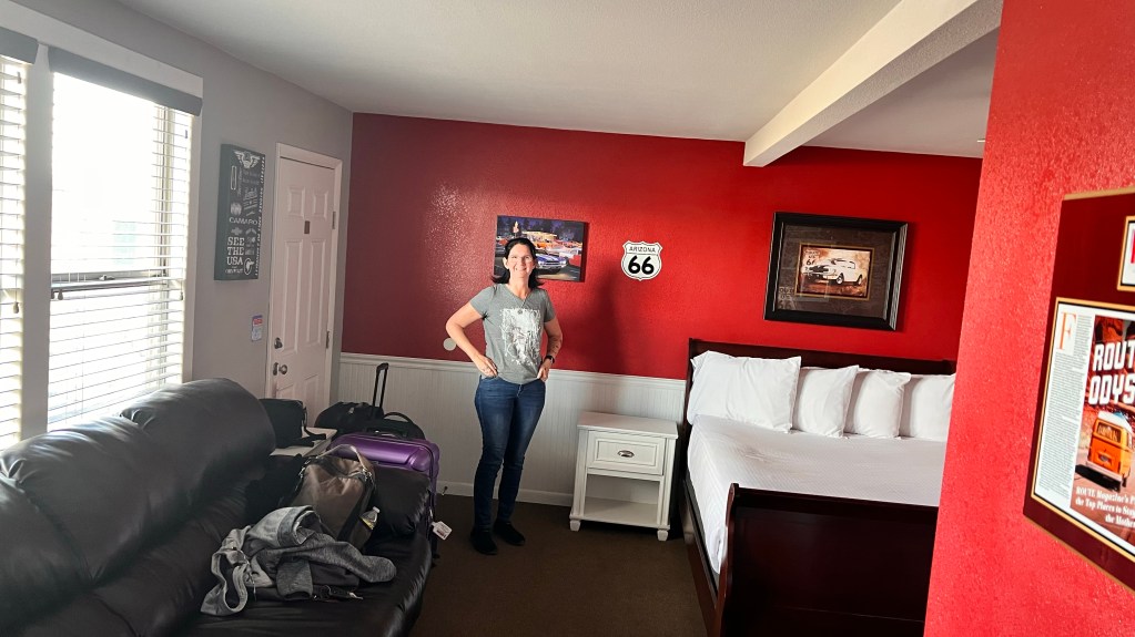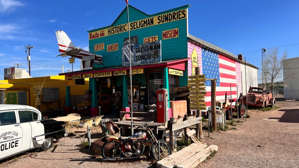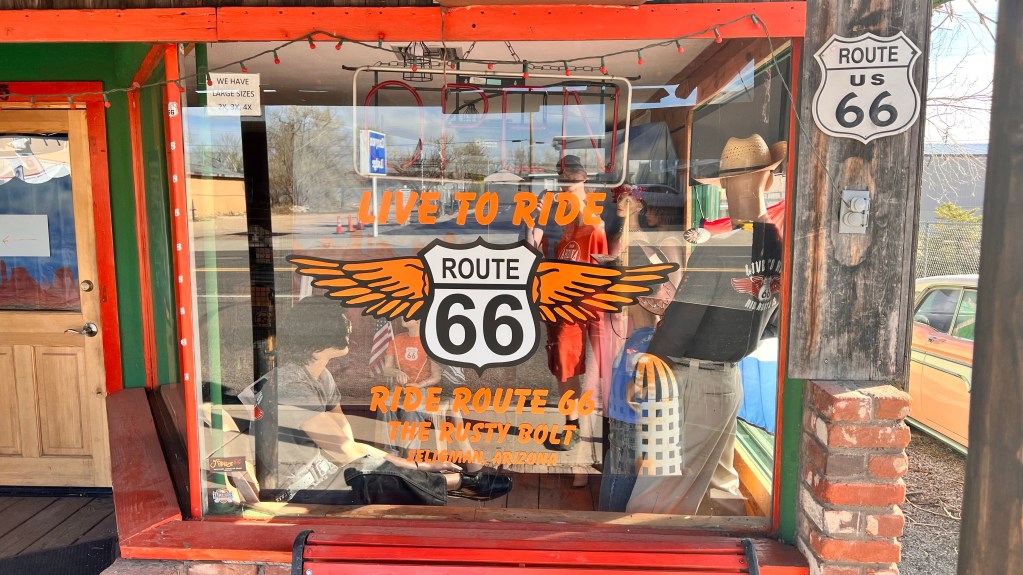 Nach dem Essen stand die letzte Strecke der heutigen Route an. 120 Kilometer nach Seligman. Die Strecke sind wir vor 5 Jahren schon einmal gefahren. Sie ist nicht besonders aufregend und länger als über die Interstate 40 aber wir wollten soviel wie möglich die originale Route 66 fahren. Wir haben in Seligman in Motel vorgebucht. Das Historic Route 66 Motel. In Seligman angekommen sagte unser Navi, das wir noch 3 Meilen fahren müssen. Haben wir was übersehen? Haben wir Außerhalb ein Zimmer gebucht? Also hielten wir an um ein paar Fotos zu schießen. Und sind dann weiter gefahren. Das Navi lotste uns zu einer Tankstelle. Sollen wir an der Tanke pennen? Ich habe auf Google Maps das Motel direkt angeklickt und siehe da, wir mussten 3 Meilen wieder zurück fahren. Ich hatte beim ersten mal die Daten direkt von Booking.com genommen. Die schienen falsch zu sein.