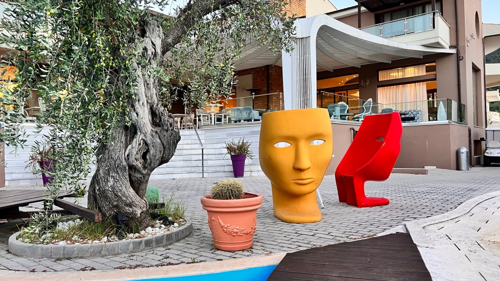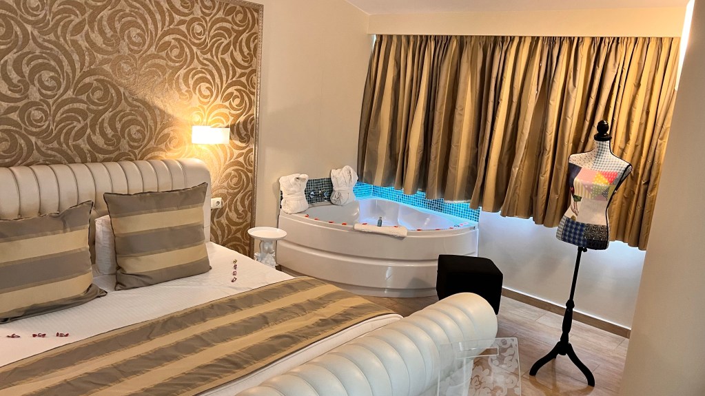 Das Frühstück ist für Griechenland sehr reichhaltig. Liegt wohl auch daran, dass hier im Hotel wohl 100% deutsche Gäste sind. Das reichhaltige Angebot hatte aber heute für uns eine fatale Auswirkung. Wir wollten gerade voll gesättigt von unserem Tisch aufstehen als das Personal „Happy Birthday“ singend mit einer Schokoladentorte zu unserem Tisch kam. Bekky hat Geburtstag. Ich habe noch überlegt, ob ich vorher was im Hotel organisiere, habe mich aber dagegen entschieden. Nett war es schon aber das Timing war nicht perfekt. Wir haben anstandshalber etwas Torte gegessen und an Nachbartische verteilt. 2 Stück sind übergeblieben, die haben wir in den Kühlschrank im Zimmer gestellt. Leider kam alles so überraschend, das ich nicht mal Fotos machen konnte.