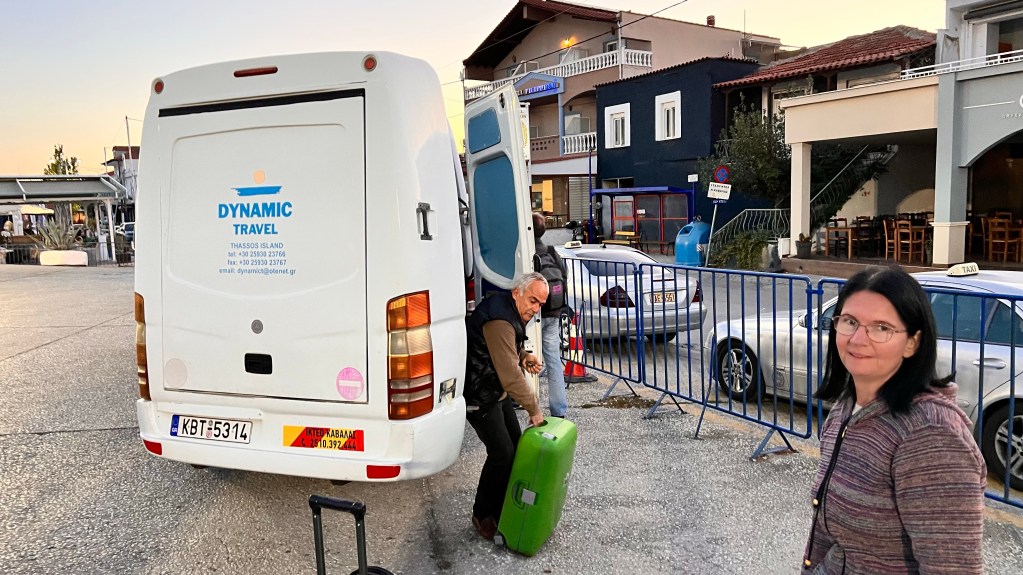 Auf der Insel Thassos angekommen wurden alle, die ein Taxi bekommen hatten, in einen Minibus gesteckt. Alle anderen wieder in den großen Bus. Wir im Minibus hatten alle das gleiche Hotel gebucht. Wir vermuten, das der große Bus an die andere Seite der Insel fährt.