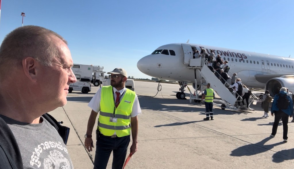 Wieder wurden wir durch einen Piepton unsanft geweckt. Diese mal war es aber kein Feueralarm sonder der Wecker. 5.40 Uhr werden wir vom Hotel abgeholt. Eine Stunde früher als wir erwartet hatten. Es hieß, dass die Fähren unregelmäßig fahren würden. Unser Flug von Kavala, dass auf dem Festland liegt, geht um 10 Uhr. Zu Fähre fahren wir 15 Minuten, die Fähre selbst benötigt 45 Minuten und zum Flughafen sind es noch einmal 15 Minuten. So Sitzen wir noch fast 3 Stunden auf diesem kleinen Flughafen rum, wo der Check In und die Sicherheitskontrolle in wenigen Minuten durch ist. Eine Stunde vor Abflug haben wir andere Leute von unserem Hotel gesehen, die nicht mit uns im Bus saßen. Sie konnten eine Stunde länger schlafen. Sie hatten über eine andere Gesellschaft gebucht.