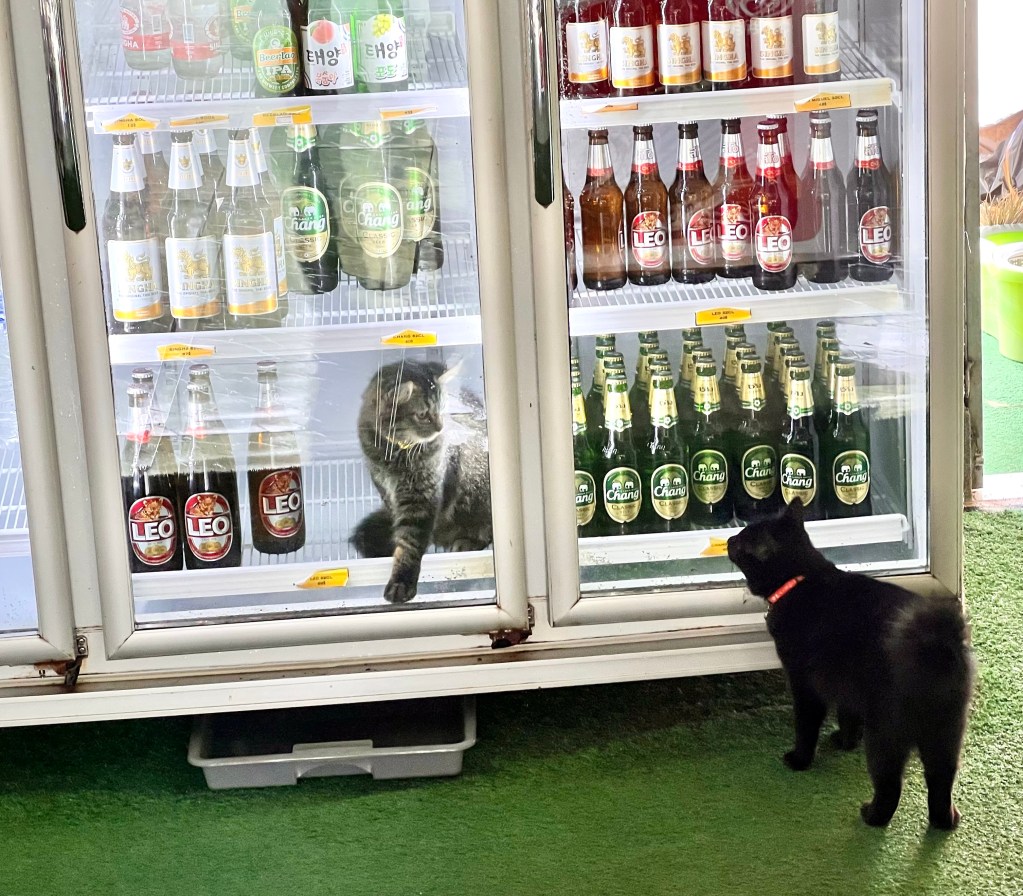 Bier wird hier langsam knapp. An einem Beach-Restaurant war es schon ausverkauft und selbst im 7/Eleven sind die Kühlschränke fast leer. Zum Kniffeln auf dem Balkon hat uns noch das erfrischende Getränk gefehlt. Also im 7/Eleven in den Kühlschrank gegriffen und einige Dosen Chang-Beer rausgenommenen. Im Zimmer angekommen, stellten wir das Bier, zwecks Kühlung wieder in den Kühlschrank.