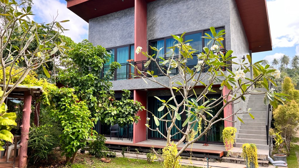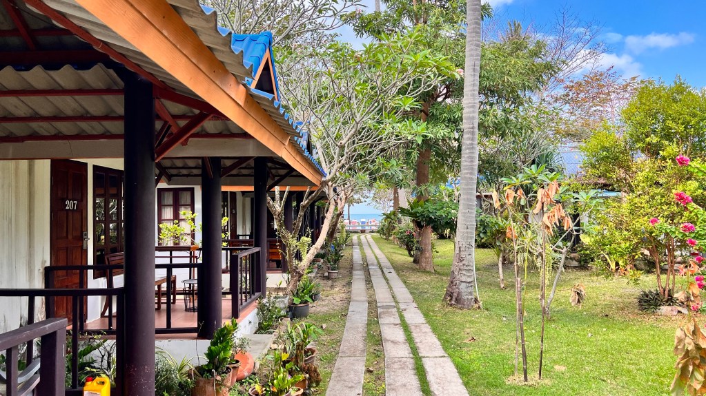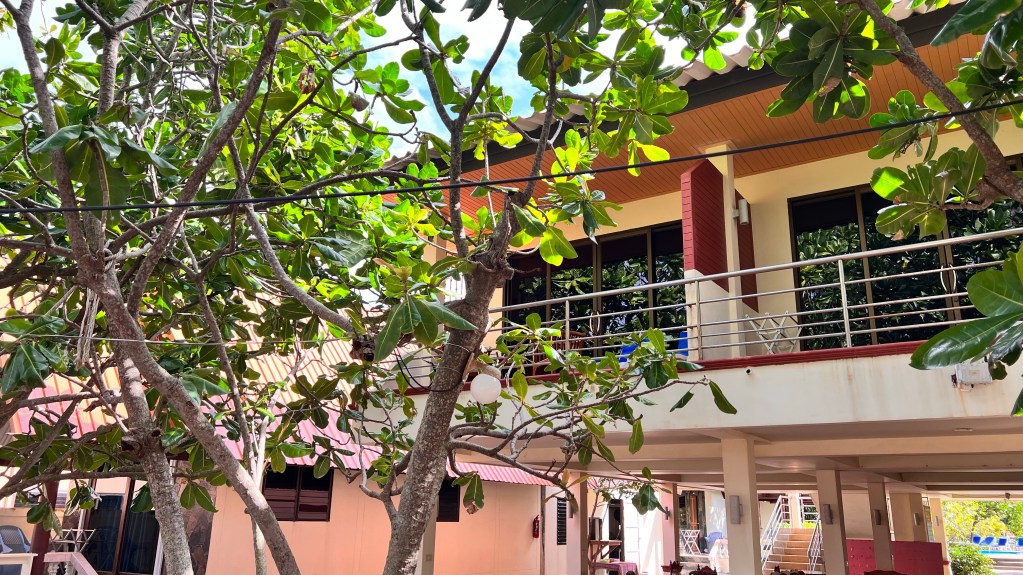 Das Lanta Summer House ist nicht so groß wie viele Nachbarhotels. Als wir vor ein paar Tagen hier waren, wollten wir einen Bungalow buchen. Leider waren alle ausgebucht. So haben wir uns ein günstiges Zimmer reserviert. Gestern dann, kurz nach der Ankunft haben wir gesehen, das es Zimmer in der 2. Etage mit großen Balkon in Blickrichtung des Meeres gibt. Kurz nachgefragt und es war noch ein Zimmer frei. Es sind Familienzimmer und etwas teurer, aber wir haben einen guten Preis bekommen. Leider verhindert die üppige Vegetation einen vollen Blick auf das Meer.