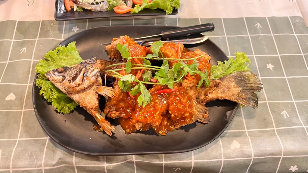 Der Fisch wurde vor dem grillen filetiert und entgrätet, alle einzelne Stücke dann gegrillt und auf dem Teller wieder zusammen gesetzt. Den dazu servierten Reis, habe ich aus dramaturgischen Gründen in der Beschreibung weggelassen. Alle Gerichte zusammen für unter 30€!