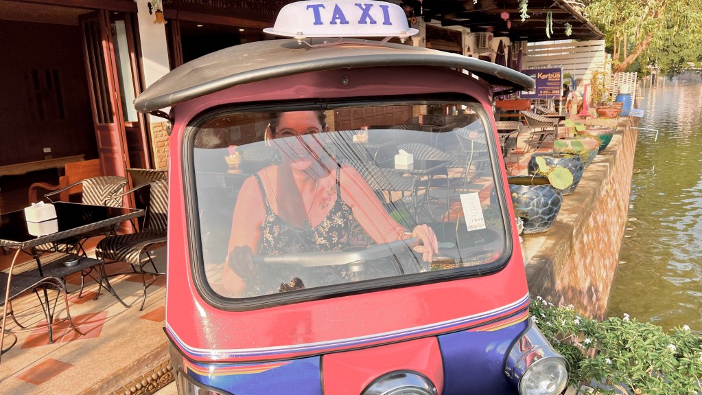 Die nette Verwalterin der Bungalowanlage hat uns nach dem Auschecken zum neuen Hotel am Khlong Dao Beach gefahren. Wir kennen ja die thailändische Freundlichkeit schon aber sie hat es noch getoppt. Zuerst die kostenfreie Nacht und nun das Fahren. Vielen Dank an dieser Stelle.