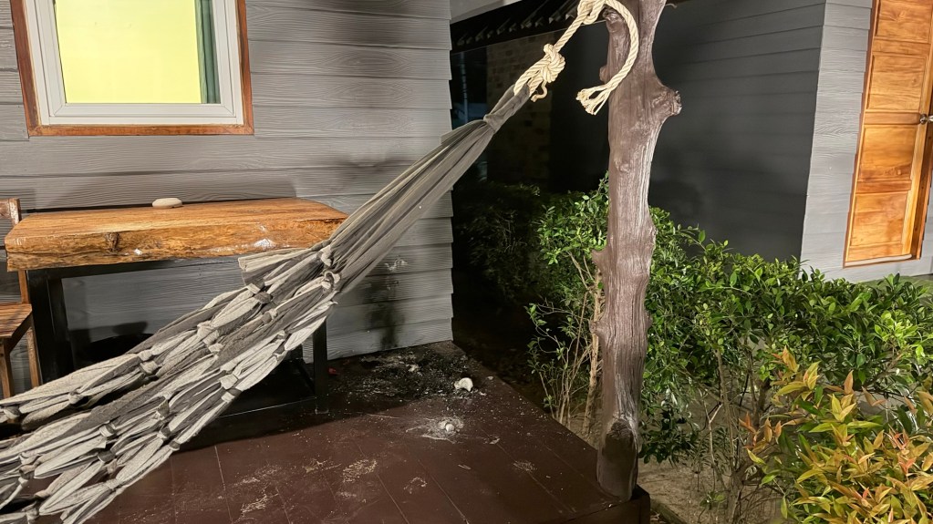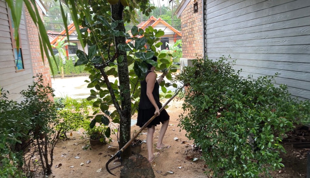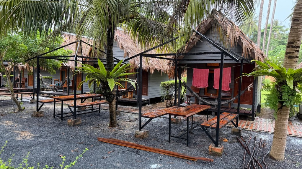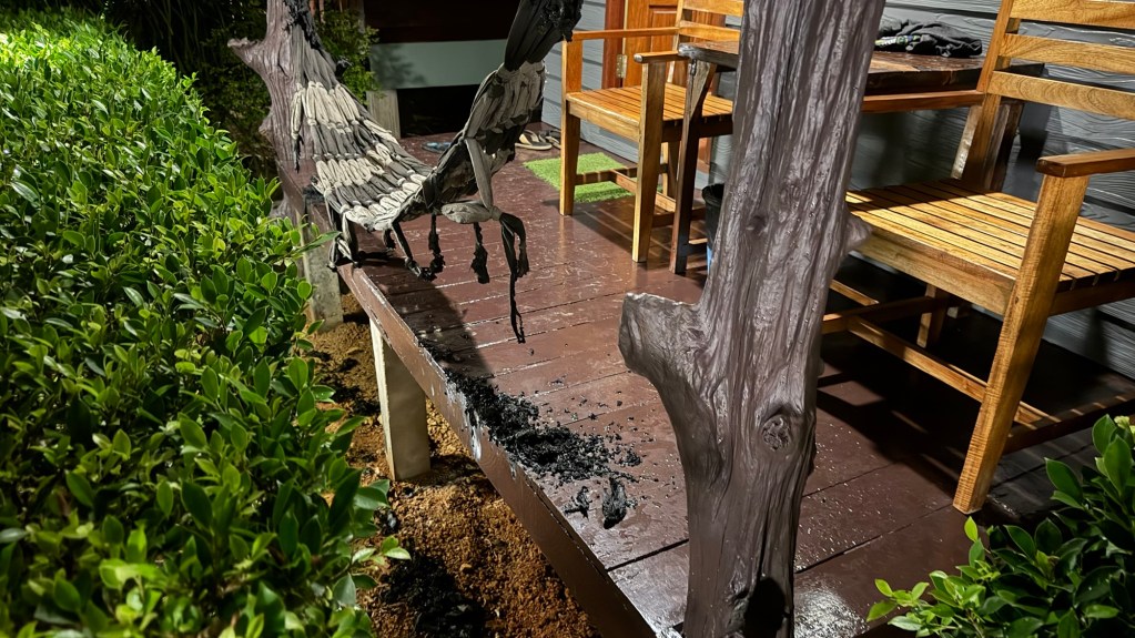 Später wurde dann noch eine Kerze unter einem Bungalow gefunden. Auf der anderen Seite in der zweiten Reihe standen vor den Bungalows mehrere überdachte Sitzbänke mit Tischen. Diese Dächer waren alle angezündet. Jetzt war klar, das war Brandstiftung. Jemand hatte versucht unsere Bungalows in der Nacht anzuzünden. Die Bewohner der Bungalows versuchten die Feuer zu löschen, was auch relativ gut gelungen ist. Gut, dass es tagsüber geregnet hatte. Wenn es schon länger Trockenzeit gewesen wäre, wäre es bestimmt anders ausgegangen. Wer weiß ob es so glimpflich ausgegangen wäre.